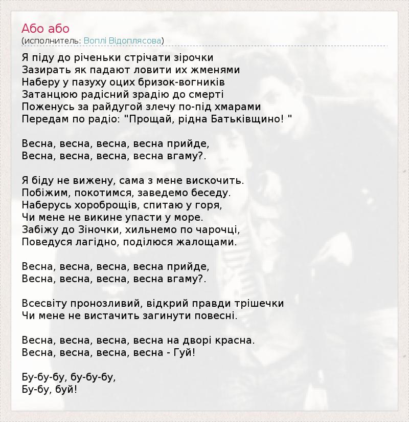 Я пiду до рiченьки стрiчати зiрочки Зазирать як падают ловити их жменями Наберу у пазуху оцих бризок-вогникiв Затанцюю радiсний зрадiю до смертi Поженусь за райдугой злечу по-пiд хмарами Передам по радiо: "Прощай, рiдна Батькiвщино! " Весна, весна, весна, весна прийде, Весна, весна, весна, весна вгаму?. Я бiду не вижену, сама з мене вискочить. Побiжим, покотимся, заведемо беседу. Наберусь хороброщiв, спитаю у горя, Чи мене не викине упасти у море. Забiжу до Зiночки, хильнемо по чарочцi, Поведуся лагiдно, подiлюся жалощами. Весна, весна, весна, весна прийде, Весна, весна, весна, весна вгаму?. Всесвiту пронозливий, вiдкрий правди трiшечки Чи мене не вистачить загинути повеснi. Весна, весна, весна, весна на дворi красна. Весна, весна, весна, весна - Гуй! Бу-бу-бу, бу-бу-бу, Бу-бу, буй!