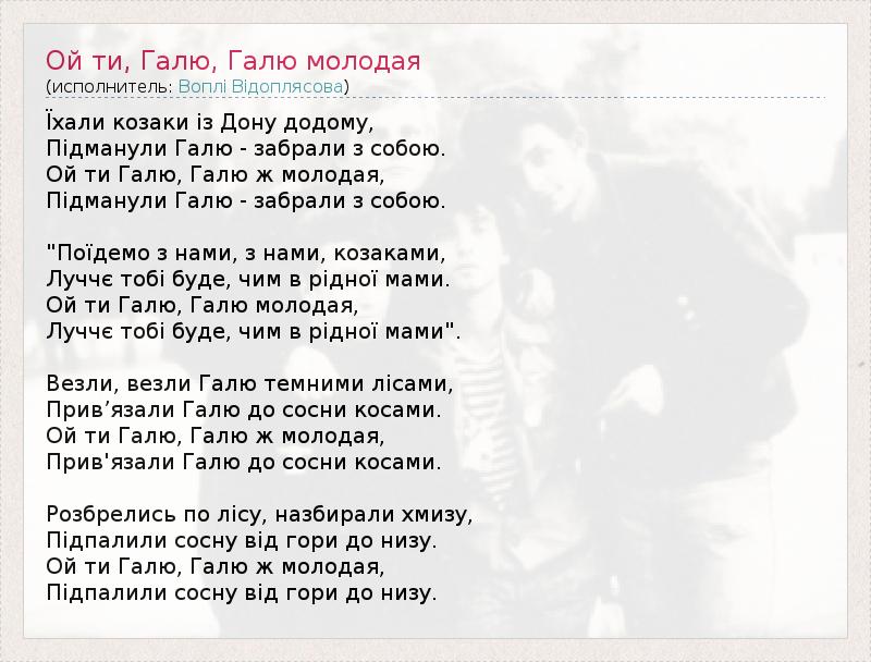 А как ты думаешь, о чем песня "Ой ти, Галю, Галю молодая" ?