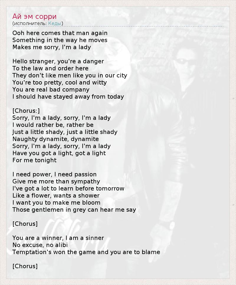 О, снова сюда идет этот мужчина... Что-то в его манерах Заставляет меня сожалеть, что я – леди. Эй, незнакомец, ты – угроза Местным законам и порядкам. В нашем городе не любят личностей такого рода, Ты слишком красив, остроумен и дерзок, Ты – дурная компания. Мне не следовало сегодня приходить... [Припев:] Прости, я – леди. Прости, я – леди. Мне следует быть, следует быть Чуть заметной тенью, чуть заметной тенью, А не взрывоопасным динамитом, динамитом... Прости, я – леди. Прости, я – леди. Не найдется ли у тебя огонька Для меня этим вечером? Мне нужна сила и страсть, Дай мне больше, чем симпатия. Мне многому надо научиться, пока не наступило завтра. Цветочку нужен дождик, А я хочу, чтобы ты заставил меня расцвести. Эти джентльмены в сером слышат что я говорю... [Припев] Ты победитель, я грешница, Ни оправданий, ни алиби, Соблазны одолели, а ты виноват. [Припев]