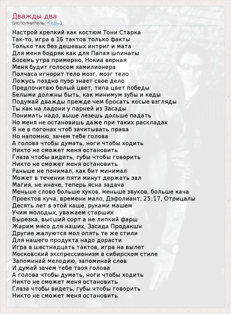 Настрой крепкий как костюм Тони Старка Так-то, игра в 16 тактов только факты Только так без дешевых интриг и мата Для меня бодряк как для Папая шпинаты Восемь утра примерно, Нокиа верная Меня будит голосом хамилионера Полчаса игнорит тело мозг, мозг тело Ложусь поздно пуэр знает свое дело Предпочитаю белый цвет, типа цвет победы Белыми должны быть, как минимум зубы и кеды Подумай дважды прежде чем бросать косые взгляды Ты как на ладони у парней из Засады Понимать надо, выше лезешь дольше падать Но меня не остановишь даже при таких раскладах Я не в погонах чтоб зачитывать права Но напомню, зачем тебе голова А голова чтобы думать, ноги чтобы ходить Никто не сможет меня остановить Глаза чтобы видеть, губы чтобы говорить Никто не сможет меня остановить Раньше не понимал, как бит минимал Может в течении пяти минут держать зал Магия, не иначе, теперь ясна задача Меньше слово больше хуков, меньше звуков, больше кача Проектов куча, времени мало, Дэфолиант, 25:17, Отрицалы Десять лет в этой каше, руками машем Учим молодых, уважаем старших Вырезка, высший сорт а не липкий фарш Жарим мясо для наших, Засада Продакшн Другие жалуются мол опять те же стили Для нашего продукта надо дорасти Игра в шестнадцать тактов, игра на вылет Московский экспрессионизм в сибирском стиле Запоминай мелодию, запоминай слов И думай зачем тебе твоя голова А голова чтобы думать, ноги чтобы ходить Никто не сможет меня остановить Глаза чтобы видеть, губы чтобы говорить Никто не сможет меня остановить