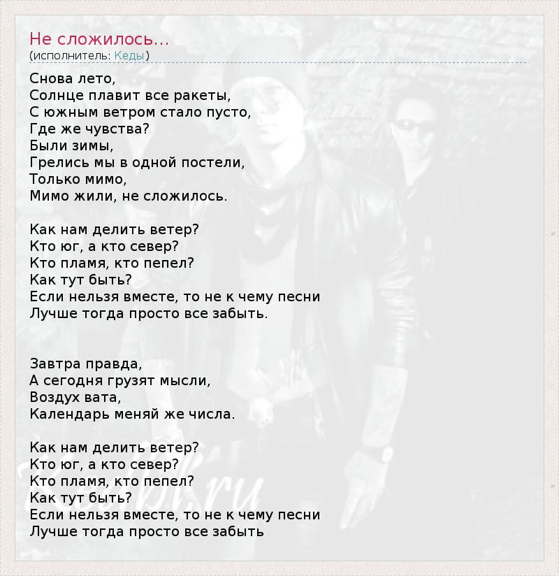 Снова лето, Солнце плавит все ракеты, С южным ветром стало пусто, Где же чувства? Были зимы, Грелись мы в одной постели, Только мимо, Мимо жили, не сложилось. Как нам делить ветер? Кто юг, а кто север? Кто пламя, кто пепел? Как тут быть? Если нельзя вместе, то не к чему песни Лучше тогда просто все забыть. Завтра правда, А сегодня грузят мысли, Воздух вата, Календарь меняй же числа. Как нам делить ветер? Кто юг, а кто север? Кто пламя, кто пепел? Как тут быть? Если нельзя вместе, то не к чему песни Лучше тогда просто все забыть