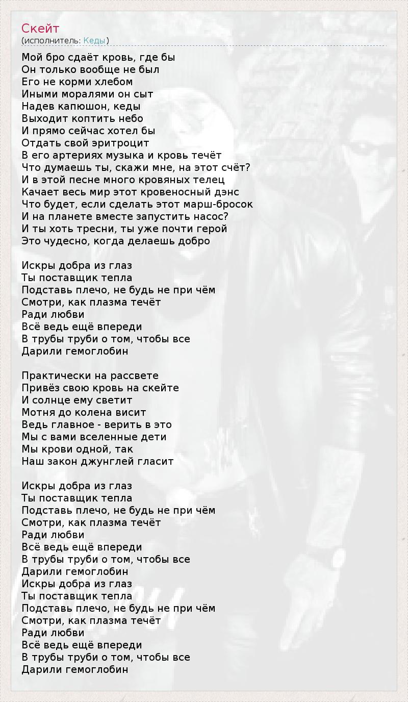 Мой бро сдаёт кровь, где бы Он только вообще не был Его не корми хлебом Иными моралями он сыт Надев капюшон, кеды Выходит коптить небо И прямо сейчас хотел бы Отдать свой эритроцит В его артериях музыка и кровь течёт Что думаешь ты, скажи мне, на этот счёт? И в этой песне много кровяных телец Качает весь мир этот кровеносный дэнс Что будет, если сделать этот марш-бросок И на планете вместе запустить насос? И ты хоть тресни, ты уже почти герой Это чудесно, когда делаешь добро Искры добра из глаз Ты поставщик тепла Подставь плечо, не будь не при чём Смотри, как плазма течёт Ради любви Всё ведь ещё впереди В трубы труби о том, чтобы все Дарили гемоглобин Практически на рассвете Привёз свою кровь на скейте И солнце ему светит Мотня до колена висит Ведь главное - верить в это Мы с вами вселенные дети Мы крови одной, так Наш закон джунглей гласит Искры добра из глаз Ты поставщик тепла Подставь плечо, не будь не при чём Смотри, как плазма течёт Ради любви Всё ведь ещё впереди В трубы труби о том, чтобы все Дарили гемоглобин Искры добра из глаз Ты поставщик тепла Подставь плечо, не будь не при чём Смотри, как плазма течёт Ради любви Всё ведь ещё впереди В трубы труби о том, чтобы все Дарили гемоглобин