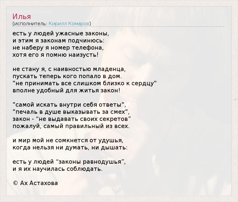 есть у людей ужасные законы, и этим я законам подчинюсь: не наберу я номер телефона, хотя его я помню наизусть! не стану я, с наивностью младенца, пускать теперь кого попало в дом. "не принимать все слишком близко к сердцу" вполне удобный для житья закон! "самой искать внутри себя ответы", "печаль в душе выказывать за смех", закон - “не выдавать своих секретов” пожалуй, самый правильный из всех. и мир мой не сомкнется от удушья, когда нельзя ни думать, ни дышать: есть у людей “законы равнодушья”, и я их научилась соблюдать. © Ах Астахова