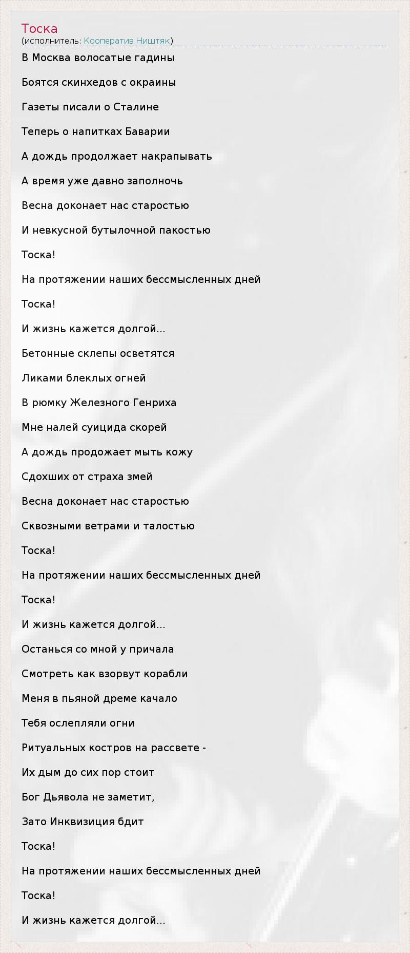 Это интересно:В начале 1990-х "КооперативништяК" был одним из наиболее ярких и известных ансамблей "сибирского панка". Коллектив возник на обломках оккультного общества в 1983 г. С группой сотрудничали в дальнейшем известные, малоизвестные и вовсе никому не известные личности, сущности и музыканты.В текстах "КооперативништяК" преобладает чёрная романтика, алхимические мотивы переплетаются... продолжение