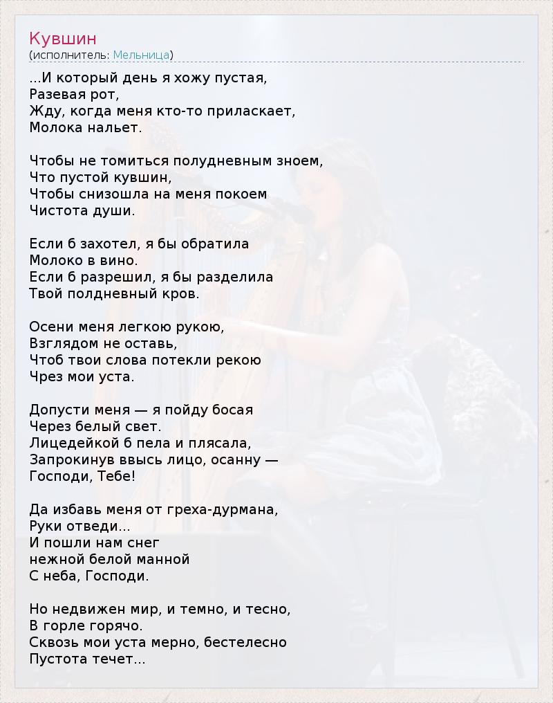 Центровейшая песня. У неё самая волшебная история. «Кувшин» был написан как заговор на беременность. Татьяна Лаврова, автор текста «Рапунцели» очень хотела второго ребёнка. У неё не получалось, и она написала два первых куплета заговора. Она предложила мне что-нибудь дописать, у неё в голове была уже музыка, но более тяжёлая и пессимистичная, потому что она совершенно отчаялась. Мы с Ольгой Лишиной, моим постоянным соавтором, поработали над текстом. И музыка получилась совершенно иная, с приветом уэбберовской Марине Магдалине. Песня сложилась, я позвонила Тане, спела ей, она попросила ещё раз спеть. Вскоре мы обнаружили, что обе беременны. Заговор сработал.