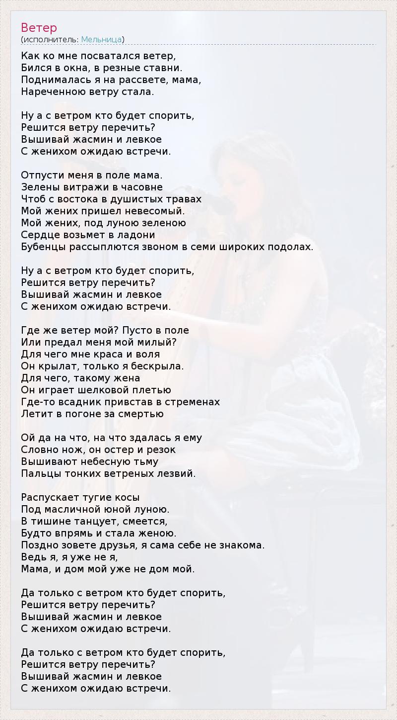 Я очень хотела написать песню на стихи Федерико Гарсии Лорки. А у Лорки всё, на что можно писать, очень длинное. В итоге мы с Олей сами написали нечто лоркообразное. Там есть небольшая отсылка к романсу Лорки «Пресьоса и Ветер», где ветер гоняется за цыганкой, пытаясь её соблазнить. У меня наоборот — цыганка влюблена в сверхъестественное существо. Непонятно, есть оно или нет.