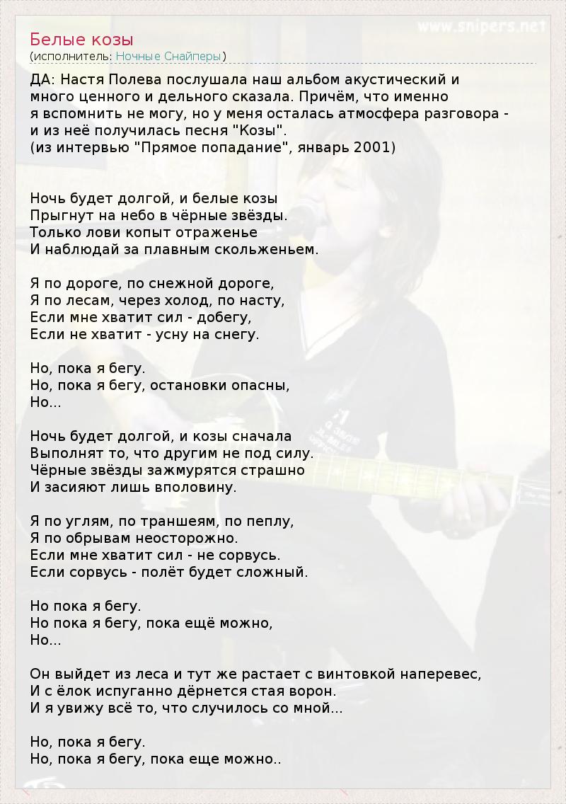 ДА: Настя Полева послушала наш альбом акустический и много ценного и дельного сказала. Причём, что именно я вспомнить не могу, но у меня осталась атмосфера разговора - и из неё получилась песня "Козы". (из интервью "Прямое попадание", январь 2001) Ночь будет долгой, и белые козы Прыгнут на небо в чёрные звёзды. Только лови копыт отраженье И наблюдай за плавным скольженьем. Я по дороге, по снежной дороге, Я по лесам, через холод, по насту, Если мне хватит сил - добегу, Если не хватит - усну на снегу. Но, пока я бегу. Но, пока я бегу, остановки опасны, Но... Ночь будет долгой, и козы сначала Выполнят то, что другим не под силу. Чёрные звёзды зажмурятся страшно И засияют лишь вполовину. Я по углям, по траншеям, по пеплу, Я по обрывам неосторожно. Если мне хватит сил - не сорвусь. Если сорвусь - полёт будет сложный. Но пока я бегу. Но пока я бегу, пока ещё можно, Но... Он выйдет из леса и тут же растает с винтовкой наперевес, И с ёлок испуганно дёрнется стая ворон. И я увижу всё то, что случилось со мной... Но, пока я бегу. Но, пока я бегу, пока еще можно..