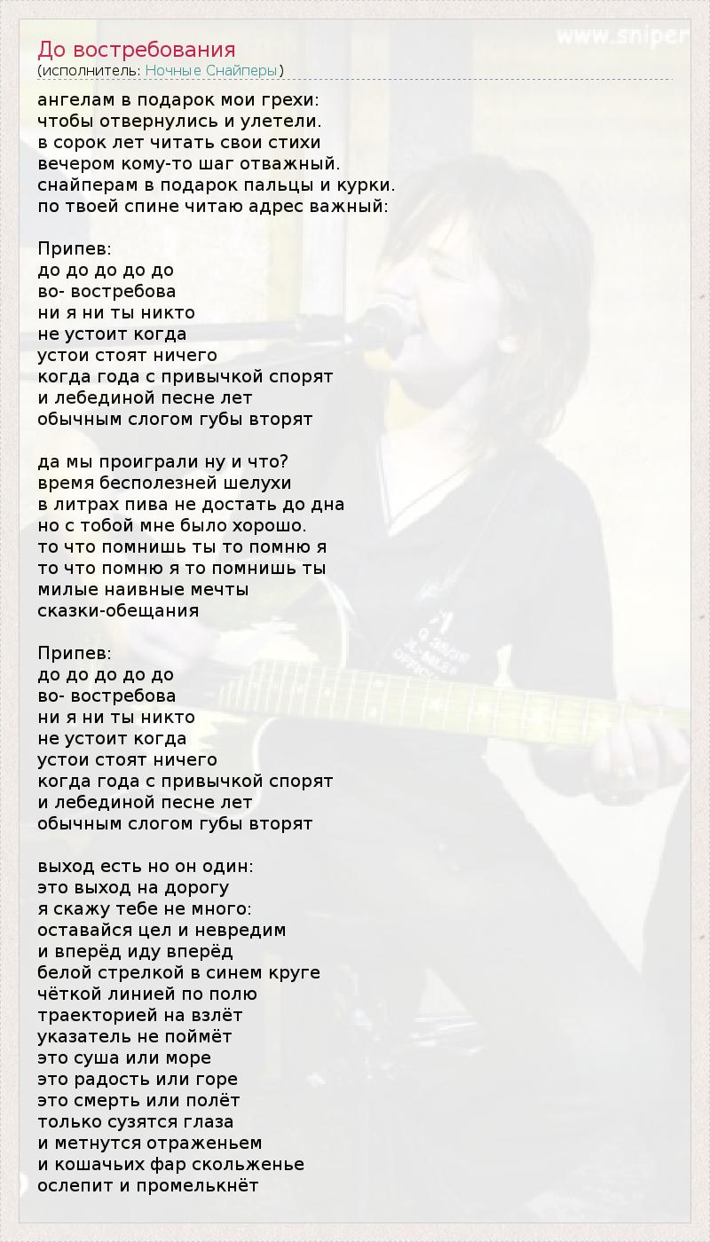 Это интересно:Российская рок-группа. Основана в 1993 году. Изначально существовала как акустический дуэт Дианы Арбениной (гитара, вокал) и Светланы Сургановой (гитара, скрипка, вокал), впоследствии обрела электрический состав. Участвовала в ряде музыкальных акций - от андеграундных ( "Бабье лето", "Могучая кучка") до крупнейших российских рок-фестивалей ("Нашествие", "Максидром", "Крылья").Наибольшую... продолжение