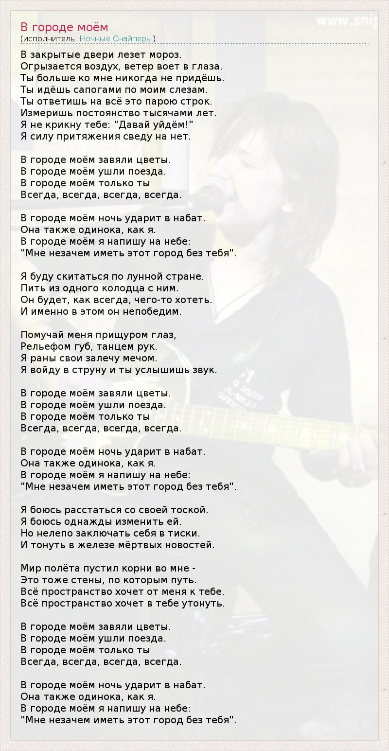 В закрытые двери лезет мороз. Огрызается воздух, ветер воет в глаза. Ты больше ко мне никогда не придёшь. Ты идёшь сапогами по моим слезам. Ты ответишь на всё это парою строк. Измеришь постоянство тысячами лет. Я не крикну тебе: "Давай уйдём!" Я силу притяжения сведу на нет. В городе моём завяли цветы. В городе моём ушли поезда. В городе моём только ты Всегда, всегда, всегда, всегда. В городе моём ночь ударит в набат. Она также одинока, как я. В городе моём я напишу на небе: "Мне незачем иметь этот город без тебя". Я буду скитаться по лунной стране. Пить из одного колодца с ним. Он будет, как всегда, чего-то хотеть. И именно в этом он непобедим. Помучай меня прищуром глаз, Рельефом губ, танцем рук. Я раны свои залечу мечом. Я войду в струну и ты услышишь звук. В городе моём завяли цветы. В городе моём ушли поезда. В городе моём только ты Всегда, всегда, всегда, всегда. В городе моём ночь ударит в набат. Она также одинока, как я. В городе моём я напишу на небе: "Мне незачем иметь этот город без тебя". Я боюсь расстаться со своей тоской. Я боюсь однажды изменить ей. Но нелепо заключать себя в тиски. И тонуть в железе мёртвых новостей. Мир полёта пустил корни во мне - Это тоже стены, по которым путь. Всё пространство хочет от меня к тебе. Всё пространство хочет в тебе утонуть. В городе моём завяли цветы. В городе моём ушли поезда. В городе моём только ты Всегда, всегда, всегда, всегда. В городе моём ночь ударит в набат. Она также одинока, как я. В городе моём я напишу на небе: "Мне незачем иметь этот город без тебя".