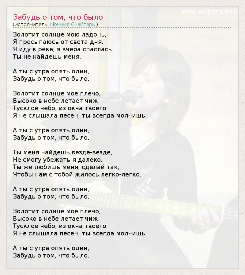 Золотит солнце мою ладонь, Я просыпаюсь от света дня. Я иду к реке, я вчера спаслась. Ты не найдешь меня. А ты с утра опять один, Забудь о том, что было. Золотит солнце мое плечо, Высоко в небе летает чиж. Тусклое небо, из окна твоего Я не слышала песен, ты всегда молчишь. А ты с утра опять один, Забудь о том, что было. Ты меня найдешь везде-везде, Не смогу убежать я далеко. Ты же любишь меня, сделай так, Чтобы нам с тобой жилось легко-легко. А ты с утра опять один, Забудь о том, что было. Золотит солнце мое плечо, Высоко в небе летает чиж. Тусклое небо, из окна твоего Я не слышала песен, ты всегда молчишь. А ты с утра опять один, Забудь о том, что было.