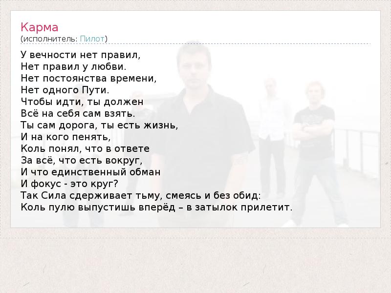 Это интересно:Группа "Пилот" образовалась 11 января 1997 года в первоначальном составе: Илья Чёрт (вокал), Ромка Чуйков (гитара), Стасики Маркофф (бас), Витя Кузьмичёв (барабаны) плюс комсостав в лице директора Карпенкова Валерия Константиновича. На дне рождения группы, который проходил в концертном зале Полигон, играли приглашенные дружественные коллективы... продолжение