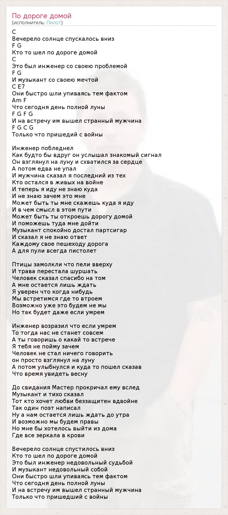 C Вечерело солнце спускалось вниз F G Кто то шел по дороге домой C Это был инженер со своею проблемой F G И музыкант со своею мечтой C E7 Они быстро шли упиваясь тем фактом Am F Что сегодня день полной луны F G F G И на встречу им вышел странный мужчина F G C G Только что пришедий с войны Инженер побледнел Как будто бы вдруг он услышал знакомый сигнал Он взглянул на луну и схватился за сердце А потом едва не упал И мужчина сказал я последний из тех Кто остался в живых на войне И теперь я иду не знаю куда И не знаю зачем это мне Может быть ты мне скажешь куда я иду И в чем смысл в этом пути Может быть ты откроешь дорогу домой И поможешь туда мне дойти Музыкант спокойно достал партсигар И сказал я не знаю ответ Каждому свое пешеходу дорога А для пули всегда пистолет Птицы замолкли что пели вверху И трава перестала шуршать Человек сказал спасибо на том А мне остается лишь ждать Я уверен что когда нибудь Мы встретимся где то втроем Возможно уже это будем не мы Но так будет даже если умрем Инженер возразил что если умрем То тогда нас не станет совсем А ты говоришь о какай то встрече Я тебя не пойму зачем Человек не стал ничего говорить он просто взглянул на луну А потом улыбнулся и куда то пошел сказав Что время увидеть весну До свидания Мастер прокричал ему вслед Музыкант и тихо сказал Тот кто хочет любви беззащитен вдвойне Так один поэт написал Ну а нам остается лишь ждать до утра И возможно мы будем правы Но мне бы хотелось выйти из дома Где все зеркала в крови Вечерело солнце спустилось вниз Кто то шел по дороге домой Это был инженер недовольный судьбой И музыкант недовольный собой Они быстро шли упиваясь тем фактом Что сегодня день полной луны И на встречу им вышел странный мужчина Только что пришедший с войны