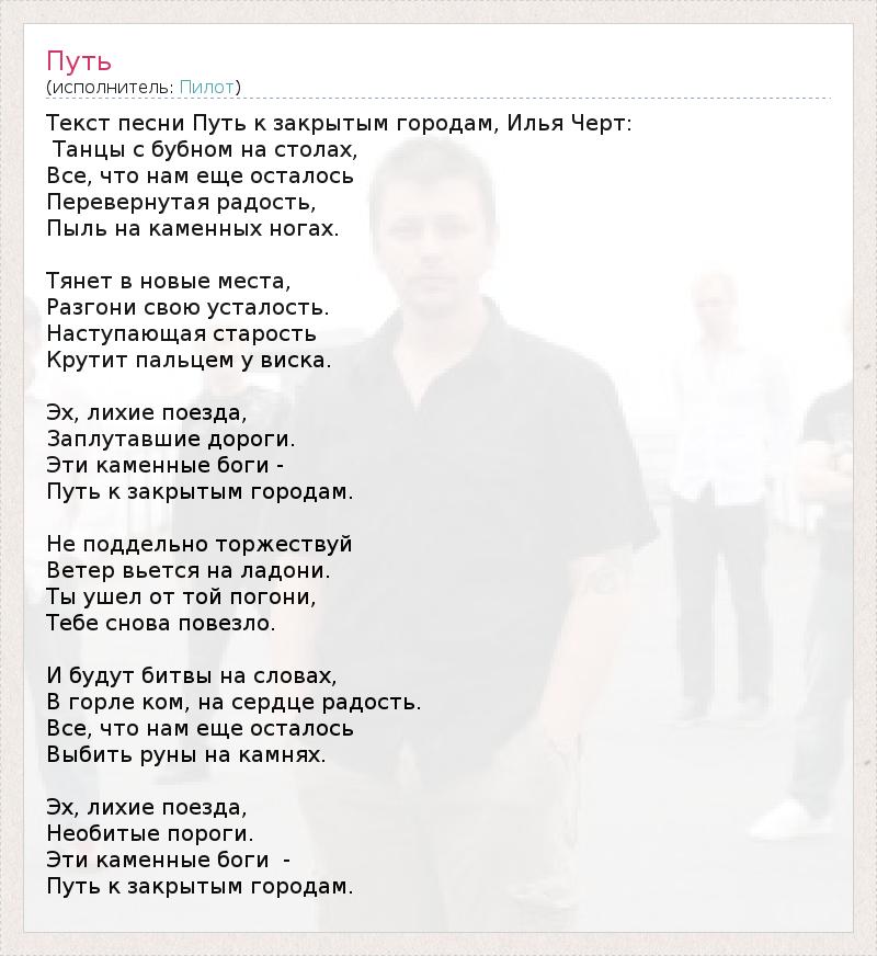 Текст песни Путь к закрытым городам, Илья Черт: Танцы с бубном на столах, Все, что нам еще осталось Перевернутая радость, Пыль на каменных ногах. Тянет в новые места, Разгони свою усталость. Наступающая старость Крутит пальцем у виска. Эх, лихие поезда, Заплутавшие дороги. Эти каменные боги - Путь к закрытым городам. Не поддельно торжествуй Ветер вьется на ладони. Ты ушел от той погони, Тебе снова повезло. И будут битвы на словах, В горле ком, на сердце радость. Все, что нам еще осталось Выбить руны на камнях. Эх, лихие поезда, Необитые пороги. Эти каменные боги - Путь к закрытым городам.