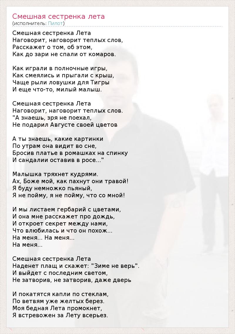 Смешная сестренка Лета Наговорит, наговорит теплых слов, Расскажет о том, об этом, Как до зари не спали от комаров. Как играли в полночные игры, Как смеялись и прыгали с крыш, Чаще рыли ловушки для Тигры И еще что-то, милый малыш. Смешная сестренка Лета Наговорит, наговорит теплых слов. "А знаешь, зря не поехал, Не подарил Августе своей цветов А ты знаешь, какие картинки По утрам она видит во сне, Бросив платье в ромашках на спинку И сандалии оставив в росе..." Малышка тряхнет кудрями. Ах, Боже мой, как пахнут они травой! Я буду немножко пьяный, Я не пойму, я не пойму, что со мной! И мы листаем гербарий с цветами, И она мне расскажет про дождь, И откроет секрет между нами, Что влюбилась и что он похож... На меня... На меня... На меня... Смешная сестренка Лета Наденет плащ и скажет: "Зиме не верь". И выйдет с последним светом, Не затворив, не затворив, даже дверь И покатятся капли по стеклам, По ветвям уже желтых берез. Моя бедная Лета промокнет, Я встревожен за Лету всерьез.