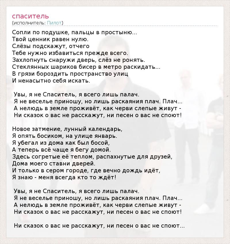 Это интересно:Группа "Пилот" образовалась 11 января 1997 года в первоначальном составе: Илья Чёрт (вокал), Ромка Чуйков (гитара), Стасики Маркофф (бас), Витя Кузьмичёв (барабаны) плюс комсостав в лице директора Карпенкова Валерия Константиновича. На дне рождения группы, который проходил в концертном зале Полигон, играли приглашенные дружественные коллективы... продолжение