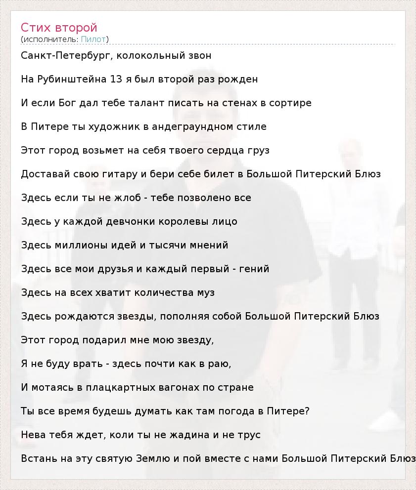 Санкт-Петербург, колокольный звон На Рубинштейна 13 я был второй раз рожден И если Бог дал тебе талант писать на стенах в сортире В Питере ты художник в андеграундном стиле Этот город возьмет на себя твоего сердца груз Доставай свою гитару и бери себе билет в Большой Питерский Блюз Здесь если ты не жлоб - тебе позволено все Здесь у каждой девчонки королевы лицо Здесь миллионы идей и тысячи мнений Здесь все мои друзья и каждый первый - гений Здесь на всех хватит количества муз Здесь рождаются звезды, пополняя собой Большой Питерский Блюз Этот город подарил мне мою звезду, Я не буду врать - здесь почти как в раю, И мотаясь в плацкартных вагонах по стране Ты все время будешь думать как там погода в Питере? Нева тебя ждет, коли ты не жадина и не трус Встань на эту святую Землю и пой вместе с нами Большой Питерский Блюз