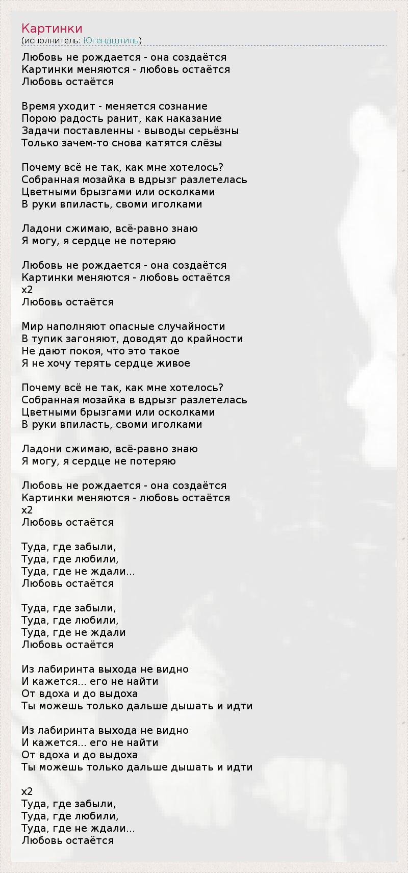Любовь не рождается - она создаётся Картинки меняются - любовь остаётся Любовь остаётся Время уходит - меняется сознание Порою радость ранит, как наказание Задачи поставленны - выводы серьёзны Только зачем-то снова катятся слёзы Почему всё не так, как мне хотелось? Собранная мозайка в вдрызг разлетелась Цветными брызгами или осколками В руки впиласть, своми иголками Ладони сжимаю, всё-равно знаю Я могу, я сердце не потеряю Любовь не рождается - она создаётся Картинки меняются - любовь остаётся x2 Любовь остаётся Мир наполняют опасные случайности В тупик загоняют, доводят до крайности Не дают покоя, что это такое Я не хочу терять сердце живое Почему всё не так, как мне хотелось? Собранная мозайка в вдрызг разлетелась Цветными брызгами или осколками В руки впиласть, своми иголками Ладони сжимаю, всё-равно знаю Я могу, я сердце не потеряю Любовь не рождается - она создаётся Картинки меняются - любовь остаётся x2 Любовь остаётся Туда, где забыли, Туда, где любили, Туда, где не ждали... Любовь остаётся Туда, где забыли, Туда, где любили, Туда, где не ждали Любовь остаётся Из лабиринта выхода не видно И кажется... его не найти От вдоха и до выдоха Ты можешь только дальше дышать и идти Из лабиринта выхода не видно И кажется... его не найти От вдоха и до выдоха Ты можешь только дальше дышать и идти x2 Туда, где забыли, Туда, где любили, Туда, где не ждали... Любовь остаётся