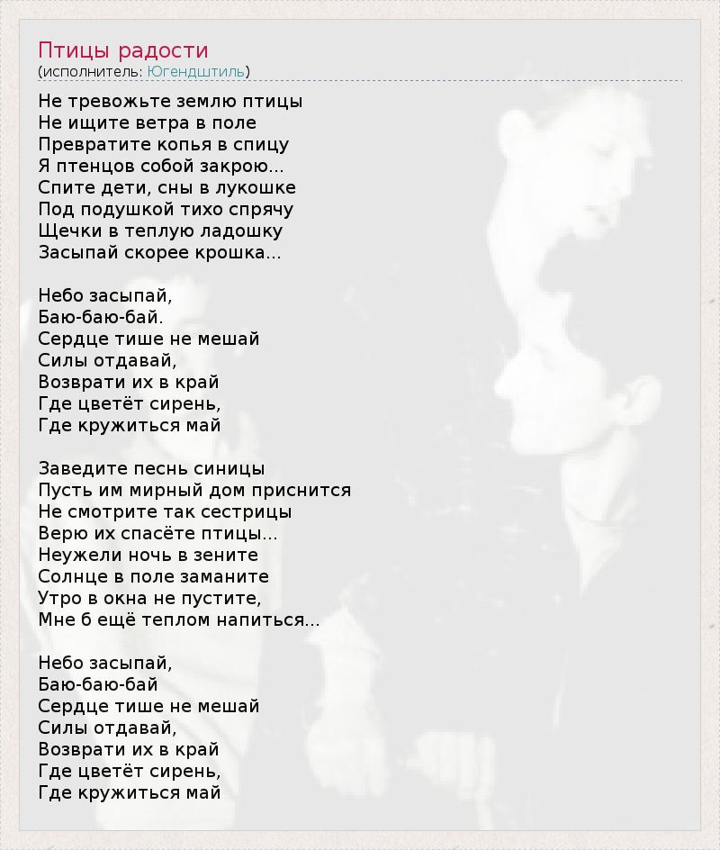 Не тревожте землю птицы, Не ищите ветра в поле, Превратите копья в спицу Я птенцов с собой закрою Спите дети сны в лукошке Под подушкой тихо спрячу Щёчки в тёплую ладочку Засыпай скорее крошка Небо засыпай баю-баю-бай Сердце тише не мешай Силой отдовай возврати их в край, где цветёт серень, где кружится май Заведите песнь синицы Пусть ей мирный дом приснится Не смотрите так сестрицы, Верю их спасёте птицы Неужели ноч в темнице Солнце в поле заманите Утро в окна не пустите Мне б еще теплом напится Небо засыпай баю-баю-бай Сердце тише не мешай Силой отдовай возврати их в край, где цветёт серень, где кружится май Небо засыпай баю-баю-бай Сердце тише не мешай Силой отдовай возврати их в край, где цветёт серень, где кружится май