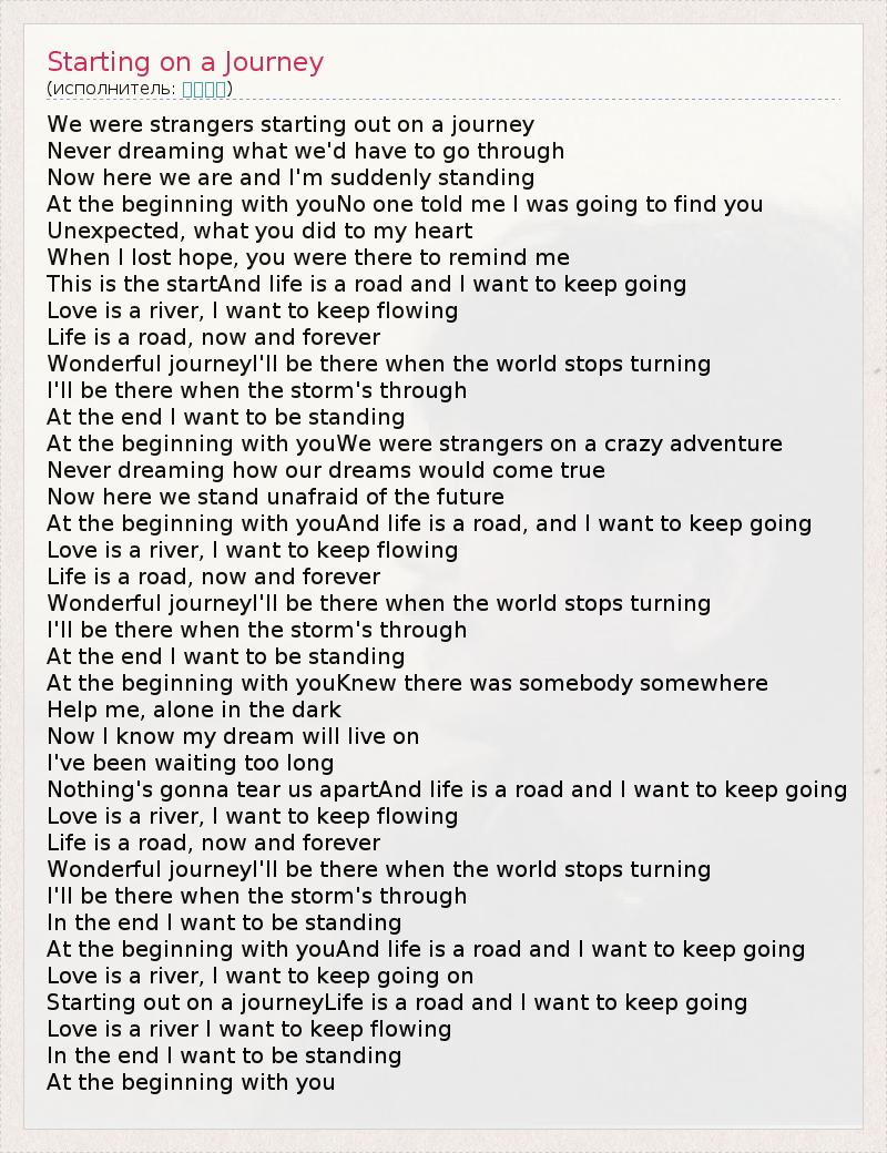 We were strangers starting out on a journey Never dreaming what we'd have to go through Now here we are and I'm suddenly standing At the beginning with youNo one told me I was going to find you Unexpected, what you did to my heart When I lost hope, you were there to remind me This is the startAnd life is a road and I want to keep going Love is a river, I want to keep flowing Life is a road, now and forever Wonderful journeyI'll be there when the world stops turning I'll be there when the storm's through At the end I want to be standing At the beginning with youWe were strangers on a crazy adventure Never dreaming how our dreams would come true Now here we stand unafraid of the future At the beginning with youAnd life is a road, and I want to keep going Love is a river, I want to keep flowing Life is a road, now and forever Wonderful journeyI'll be there when the world stops turning I'll be there when the storm's through At the end I want to be standing At the beginning with youKnew there was somebody somewhere Help me, alone in the dark Now I know my dream will live on I've been waiting too long Nothing's gonna tear us apartAnd life is a road and I want to keep going Love is a river, I want to keep flowing Life is a road, now and forever Wonderful journeyI'll be there when the world stops turning I'll be there when the storm's through In the end I want to be standing At the beginning with youAnd life is a road and I want to keep going Love is a river, I want to keep going on Starting out on a journeyLife is a road and I want to keep going Love is a river I want to keep flowing In the end I want to be standing At the beginning with you