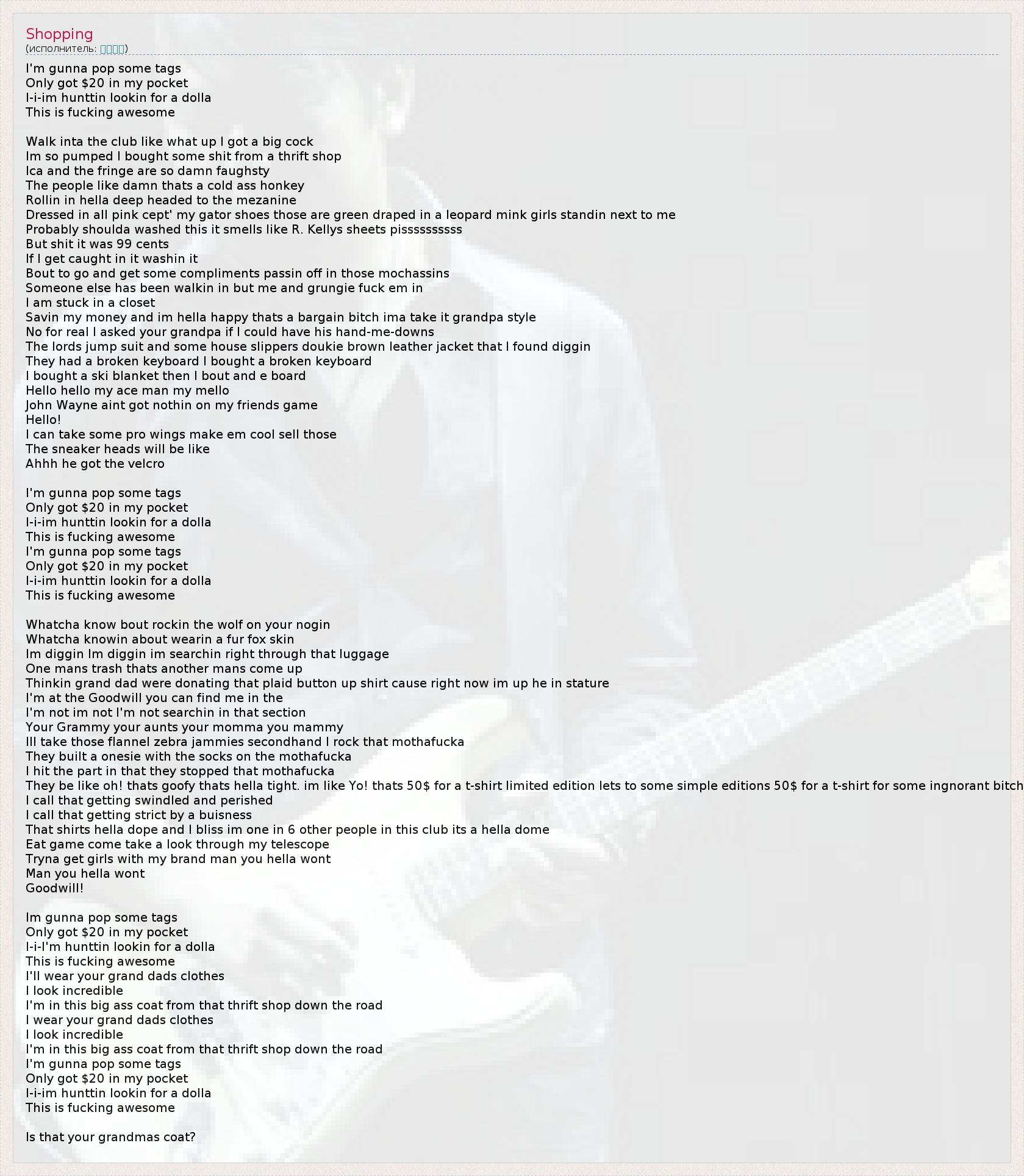 I'm gunna pop some tags Only got $20 in my pocket I-i-im hunttin lookin for a dolla This is fucking awesome Walk inta the club like what up I got a big cock Im so pumped I bought some shit from a thrift shop Ica and the fringe are so damn faughsty The people like damn thats a cold ass honkey Rollin in hella deep headed to the mezanine Dressed in all pink cept' my gator shoes those are green draped in a leopard mink girls standin next to me Probably shoulda washed this it smells like R. Kellys sheets pissssssssss But shit it was 99 cents If I get caught in it washin it Bout to go and get some compliments passin off in those mochassins Someone else has been walkin in but me and grungie fuck em in I am stuck in a closet Savin my money and im hella happy thats a bargain bitch ima take it grandpa style No for real I asked your grandpa if I could have his hand-me-downs The lords jump suit and some house slippers doukie brown leather jacket that I found diggin They had a broken keyboard I bought a broken keyboard I bought a ski blanket then I bout and e board Hello hello my ace man my mello John Wayne aint got nothin on my friends game Hello! I can take some pro wings make em cool sell those The sneaker heads will be like Ahhh he got the velcro I'm gunna pop some tags Only got $20 in my pocket I-i-im hunttin lookin for a dolla This is fucking awesome I'm gunna pop some tags Only got $20 in my pocket I-i-im hunttin lookin for a dolla This is fucking awesome Whatcha know bout rockin the wolf on your nogin Whatcha knowin about wearin a fur fox skin Im diggin Im diggin im searchin right through that luggage One mans trash thats another mans come up Thinkin grand dad were donating that plaid button up shirt cause right now im up he in stature I'm at the Goodwill you can find me in the I'm not im not I'm not searchin in that section Your Grammy your aunts your momma you mammy Ill take those flannel zebra jammies secondhand I rock that mothafucka They built a onesie with the socks on the mothafucka I hit the part in that they stopped that mothafucka They be like oh! thats goofy thats hella tight. im like Yo! thats 50$ for a t-shirt limited edition lets to some simple editions 50$ for a t-shirt for some ingnorant bitch I call that getting swindled and perished I call that getting strict by a buisness That shirts hella dope and I bliss im one in 6 other people in this club its a hella dome Eat game come take a look through my telescope Tryna get girls with my brand man you hella wont Man you hella wont Goodwill! Im gunna pop some tags Only got $20 in my pocket I-i-I'm hunttin lookin for a dolla This is fucking awesome I'll wear your grand dads clothes I look incredible I'm in this big ass coat from that thrift shop down the road I wear your grand dads clothes I look incredible I'm in this big ass coat from that thrift shop down the road I'm gunna pop some tags Only got $20 in my pocket I-i-im hunttin lookin for a dolla This is fucking awesome Is that your grandmas coat?