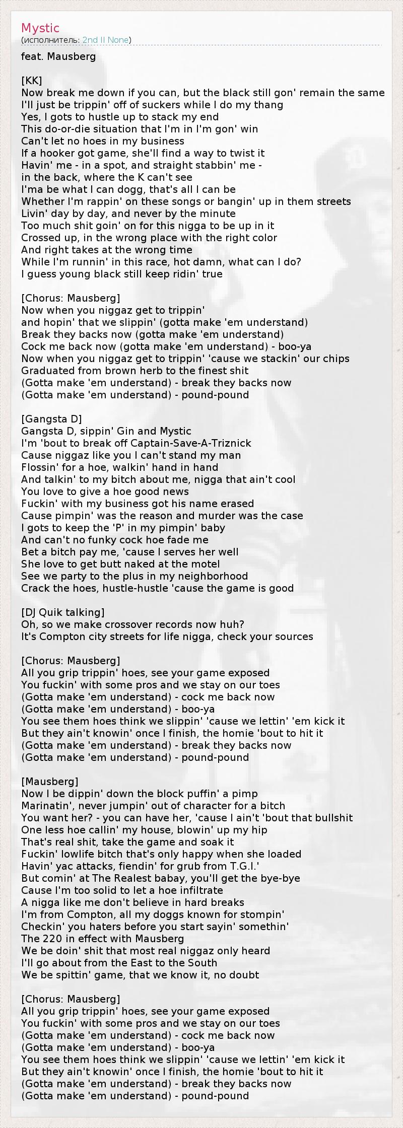 Это интересно:2nd II None - рэп группа из Комптона (Калифорния). Состоит из двух двоюрдных братьев: KK (настоящее имя K. McDonald) и Gangsta D (D. Barnett).Они выпустили свой первый альбом в 1991, названный по имени группы "2nd II None", записанный на студии Profile Records. Их второй альбом, "Classic 220" (Arista Records), вышел 8 лет спустя после дебюта. Третий альбом был почти целиком спродюсирован другом детства, рэп-легендой DJ Quik. В основном... продолжение