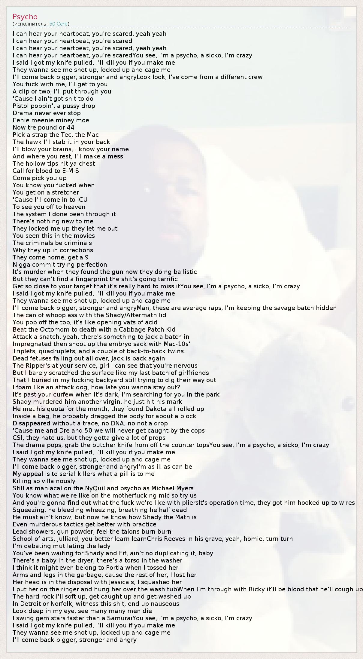 I can hear your heartbeat, you're scared, yeah yeah I can hear your heartbeat, you're scared I can hear your heartbeat, you're scared, yeah yeah I can hear your heartbeat, you're scaredYou see, I'm a psycho, a sicko, I'm crazy I said I got my knife pulled, I'll kill you if you make me They wanna see me shot up, locked up and cage me I'll come back bigger, stronger and angryLook look, I've come from a different crew You fuck with me, I'll get to you A clip or two, I'll put through you 'Cause I ain't got shit to do Pistol poppin', a pussy drop Drama never ever stop Eenie meenie miney moe Now tre pound or 44 Pick a strap the Tec, the Mac The hawk I'll stab it in your back I'll blow your brains, I know your name And where you rest, I'll make a mess The hollow tips hit ya chest Call for blood to E-M-S Come pick you up You know you fucked when You get on a stretcher 'Cause I'll come in to ICU To see you off to heaven The system I done been through it There's nothing new to me They locked me up they let me out You seen this in the movies The criminals be criminals Why they up in corrections They come home, get a 9 Nigga commit trying perfection It's murder when they found the gun now they doing ballistic But they can't find a fingerprint the shit's going terrific Get so close to your target that it's really hard to miss itYou see, I'm a psycho, a sicko, I'm crazy I said I got my knife pulled, I'll kill you if you make me They wanna see me shot up, locked up and cage me I'll come back bigger, stronger and angryMan, these are average raps, I'm keeping the savage batch hidden The can of whoop ass with the Shady/Aftermath lid You pop off the top, it's like opening vats of acid Beat the Octomom to death with a Cabbage Patch Kid Attack a snatch, yeah, there's something to jack a batch in Impregnated then shoot up the embryo sack with Mac-10s' Triplets, quadruplets, and a couple of back-to-back twins Dead fetuses falling out all over, Jack is back again The Ripper's at your service, girl I can see that you're nervous But I barely scratched the surface like my last batch of girlfriends That I buried in my fucking backyard still trying to dig their way out I foam like an attack dog, how late you wanna stay out? It's past your curfew when it's dark, I'm searching for you in the park Shady murdered him another virgin, he just hit his mark He met his quota for the month, they found Dakota all rolled up Inside a bag, he probably dragged the body for about a block Disappeared without a trace, no DNA, no not a drop 'Cause me and Dre and 50 we will never get caught by the cops CSI, they hate us, but they gotta give a lot of props The drama pops, grab the butcher knife from off the counter topsYou see, I'm a psycho, a sicko, I'm crazy I said I got my knife pulled, I'll kill you if you make me They wanna see me shot up, locked up and cage me I'll come back bigger, stronger and angryI'm as ill as can be My appeal is to serial killers what a pill is to me Killing so villainously Still as maniacal on the NyQuil and psycho as Michael Myers You know what we're like on the motherfucking mic so try us And you're gonna find out what the fuck we're like with pliersIt's operation time, they got him hooked up to wires Squeezing, he bleeding wheezing, breathing he half dead He must ain't know, but now he know how Shady the Math is Even murderous tactics get better with practice Lead showers, gun powder, feel the talons burn burn School of arts, Julliard, you better learn learnChris Reeves in his grave, yeah, homie, turn turn I'm debating mutilating the lady You've been waiting for Shady and Fif, ain't no duplicating it, baby There's a baby in the dryer, there's a torso in the washer I think it might even belong to Portia when I tossed her Arms and legs in the garbage, cause the rest of her, I lost her Her head is in the disposal with Jessica's, I squashed her I put her on the ringer and hung her over the wash tubWhen I'm through with Ricky it'll be blood that he'll cough up The hard rock I'll soft up, get caught up and get washed up In Detroit or Norfolk, witness this shit, end up nauseous Look deep in my eye, see many many men die I swing gem stars faster than a SamuraiYou see, I'm a psycho, a sicko, I'm crazy I said I got my knife pulled, I'll kill you if you make me They wanna see me shot up, locked up and cage me I'll come back bigger, stronger and angry