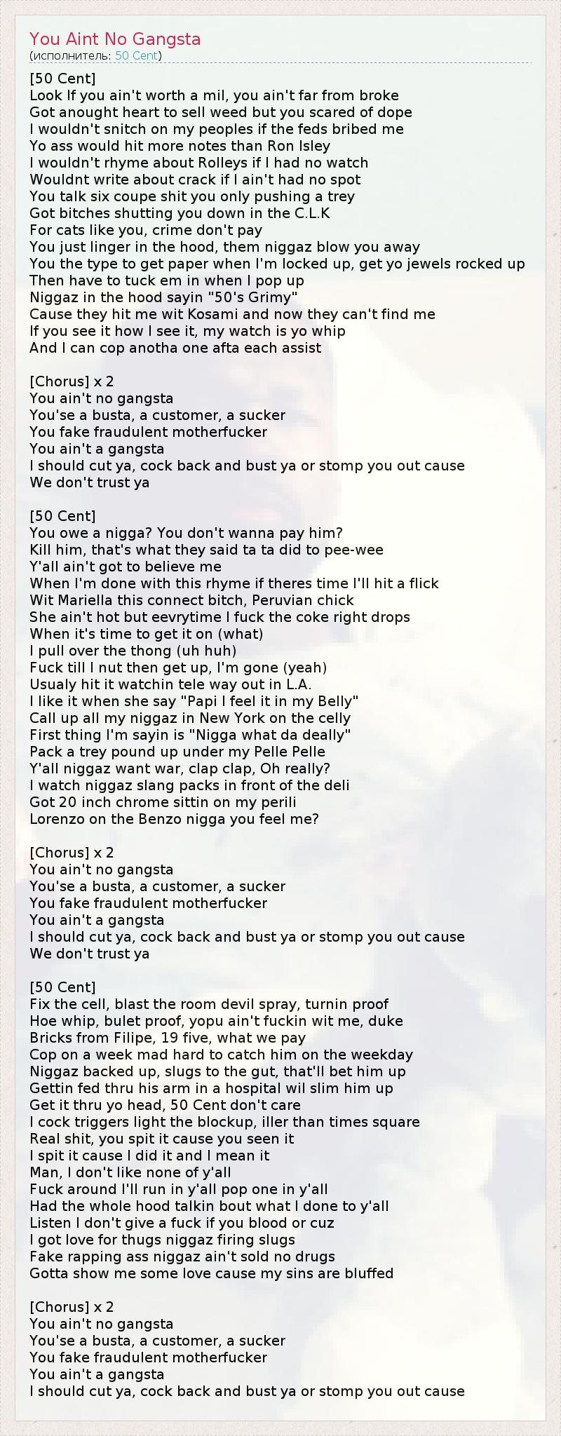 [50 Cent] Look If you ain't worth a mil, you ain't far from broke Got anought heart to sell weed but you scared of dope I wouldn't snitch on my peoples if the feds bribed me Yo ass would hit more notes than Ron Isley I wouldn't rhyme about Rolleys if I had no watch Wouldnt write about crack if I ain't had no spot You talk six coupe shit you only pushing a trey Got bitches shutting you down in the C.L.K For cats like you, crime don't pay You just linger in the hood, them niggaz blow you away You the type to get paper when I'm locked up, get yo jewels rocked up Then have to tuck em in when I pop up Niggaz in the hood sayin "50's Grimy" Cause they hit me wit Kosami and now they can't find me If you see it how I see it, my watch is yo whip And I can cop anotha one afta each assist [Chorus] x 2 You ain't no gangsta You'se a busta, a customer, a sucker You fake fraudulent motherfucker You ain't a gangsta I should cut ya, cock back and bust ya or stomp you out cause We don't trust ya [50 Cent] You owe a nigga? You don't wanna pay him? Kill him, that's what they said ta ta did to pee-wee Y'all ain't got to believe me When I'm done with this rhyme if theres time I'll hit a flick Wit Mariella this connect bitch, Peruvian chick She ain't hot but eevrytime I fuck the coke right drops When it's time to get it on (what) I pull over the thong (uh huh) Fuck till I nut then get up, I'm gone (yeah) Usualy hit it watchin tele way out in L.A. I like it when she say "Papi I feel it in my Belly" Call up all my niggaz in New York on the celly First thing I'm sayin is "Nigga what da deally" Pack a trey pound up under my Pelle Pelle Y'all niggaz want war, clap clap, Oh really? I watch niggaz slang packs in front of the deli Got 20 inch chrome sittin on my perili Lorenzo on the Benzo nigga you feel me? [Chorus] x 2 You ain't no gangsta You'se a busta, a customer, a sucker You fake fraudulent motherfucker You ain't a gangsta I should cut ya, cock back and bust ya or stomp you out cause We don't trust ya [50 Cent] Fix the cell, blast the room devil spray, turnin proof Hoe whip, bulet proof, yopu ain't fuckin wit me, duke Bricks from Filipe, 19 five, what we pay Cop on a week mad hard to catch him on the weekday Niggaz backed up, slugs to the gut, that'll bet him up Gettin fed thru his arm in a hospital wil slim him up Get it thru yo head, 50 Cent don't care I cock triggers light the blockup, iller than times square Real shit, you spit it cause you seen it I spit it cause I did it and I mean it Man, I don't like none of y'all Fuck around I'll run in y'all pop one in y'all Had the whole hood talkin bout what I done to y'all Listen I don't give a fuck if you blood or cuz I got love for thugs niggaz firing slugs Fake rapping ass niggaz ain't sold no drugs Gotta show me some love cause my sins are bluffed [Chorus] x 2 You ain't no gangsta You'se a busta, a customer, a sucker You fake fraudulent motherfucker You ain't a gangsta I should cut ya, cock back and bust ya or stomp you out cause