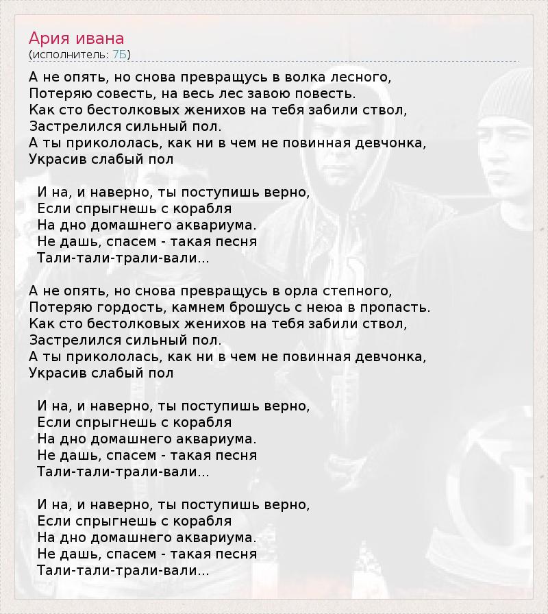 А не опять, но снова превращусь в волка лесного, Потеряю совесть, на весь лес завою повесть. Как сто бестолковых женихов на тебя забили ствол, Застрелился сильный пол. А ты прикололась, как ни в чем не повинная девчонка, Украсив слабый пол И на, и наверно, ты поступишь верно, Если спрыгнешь с корабля На дно домашнего аквариума. Не дашь, спасем - такая песня Тали-тали-трали-вали... А не опять, но снова превращусь в орла степного, Потеряю гордость, камнем брошусь с неюа в пропасть. Как сто бестолковых женихов на тебя забили ствол, Застрелился сильный пол. А ты прикололась, как ни в чем не повинная девчонка, Украсив слабый пол И на, и наверно, ты поступишь верно, Если спрыгнешь с корабля На дно домашнего аквариума. Не дашь, спасем - такая песня Тали-тали-трали-вали... И на, и наверно, ты поступишь верно, Если спрыгнешь с корабля На дно домашнего аквариума. Не дашь, спасем - такая песня Тали-тали-трали-вали...