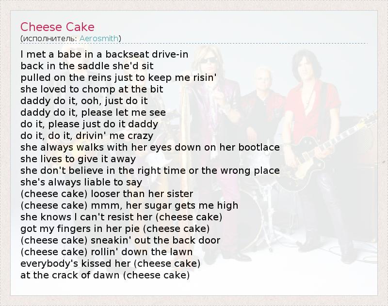 I met a babe in a backseat drive-in back in the saddle she'd sit pulled on the reins just to keep me risin' she loved to chomp at the bit daddy do it, ooh, just do it daddy do it, please let me see do it, please just do it daddy do it, do it, drivin' me crazy she always walks with her eyes down on her bootlace she lives to give it away she don't believe in the right time or the wrong place she's always liable to say (cheese cake) looser than her sister (cheese cake) mmm, her sugar gets me high she knows I can't resist her (cheese cake) got my fingers in her pie (cheese cake) (cheese cake) sneakin' out the back door (cheese cake) rollin' down the lawn everybody's kissed her (cheese cake) at the crack of dawn (cheese cake)