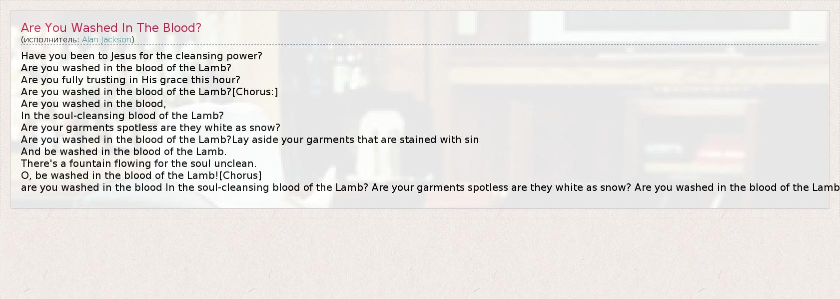 Have you been to Jesus for the cleansing power? Are you washed in the blood of the Lamb? Are you fully trusting in His grace this hour? Are you washed in the blood of the Lamb?[Chorus:] Are you washed in the blood, In the soul-cleansing blood of the Lamb? Are your garments spotless are they white as snow? Are you washed in the blood of the Lamb?Lay aside your garments that are stained with sin And be washed in the blood of the Lamb. There's a fountain flowing for the soul unclean. O, be washed in the blood of the Lamb![Chorus] are you washed in the blood In the soul-cleansing blood of the Lamb? Are your garments spotless are they white as snow? Are you washed in the blood of the Lamb