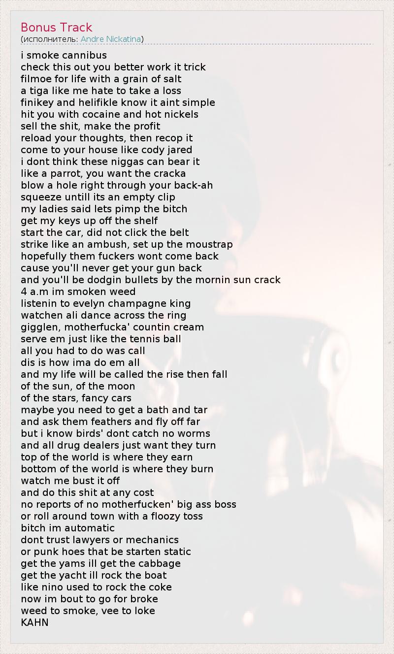 i smoke cannibus check this out you better work it trick filmoe for life with a grain of salt a tiga like me hate to take a loss finikey and helifikle know it aint simple hit you with cocaine and hot nickels sell the shit, make the profit reload your thoughts, then recop it come to your house like cody jared i dont think these niggas can bear it like a parrot, you want the cracka blow a hole right through your back-ah squeeze untill its an empty clip my ladies said lets pimp the bitch get my keys up off the shelf start the car, did not click the belt strike like an ambush, set up the moustrap hopefully them fuckers wont come back cause you'll never get your gun back and you'll be dodgin bullets by the mornin sun crack 4 a.m im smoken weed listenin to evelyn champagne king watchen ali dance across the ring gigglen, motherfucka' countin cream serve em just like the tennis ball all you had to do was call dis is how ima do em all and my life will be called the rise then fall of the sun, of the moon of the stars, fancy cars maybe you need to get a bath and tar and ask them feathers and fly off far but i know birds' dont catch no worms and all drug dealers just want they turn top of the world is where they earn bottom of the world is where they burn watch me bust it off and do this shit at any cost no reports of no motherfucken' big ass boss or roll around town with a floozy toss bitch im automatic dont trust lawyers or mechanics or punk hoes that be starten static get the yams ill get the cabbage get the yacht ill rock the boat like nino used to rock the coke now im bout to go for broke weed to smoke, vee to loke KAHN