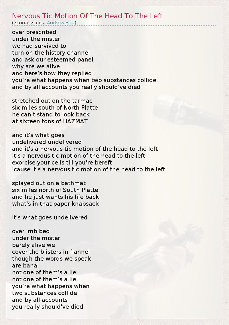 А как ты думаешь, о чем песня "Nervous Tic Motion Of The Head To The Left" ?