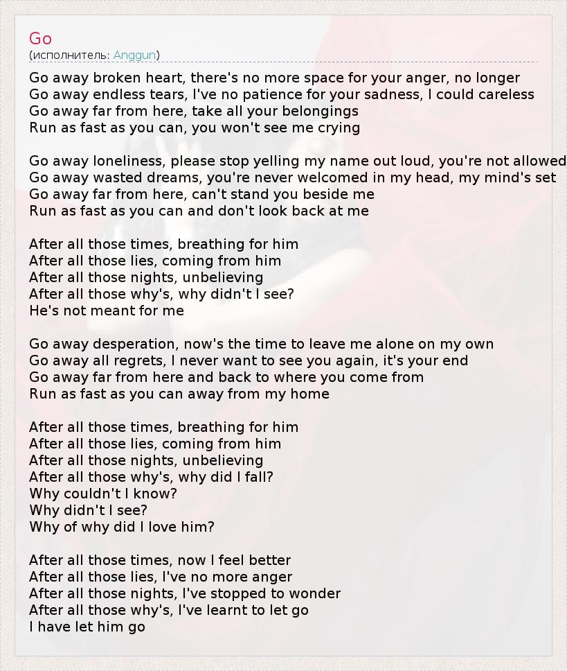 Go away broken heart, there's no more space for your anger, no longer