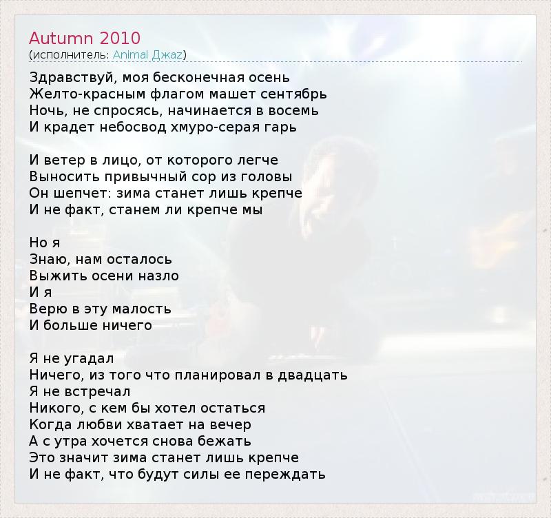 Здравствуй, моя бесконечная осень Желто-красным флагом машет сентябрь Ночь, не спросясь, начинается в восемь И крадет небосвод хмуро-серая гарь И ветер в лицо, от которого легче Выносить привычный сор из головы Он шепчет: зима станет лишь крепче И не факт, станем ли крепче мы Но я Знаю, нам осталось Выжить осени назло И я Верю в эту малость И больше ничего Я не угадал Ничего, из того что планировал в двадцать Я не встречал Никого, с кем бы хотел остаться Когда любви хватает на вечер А с утра хочется снова бежать Это значит зима станет лишь крепче