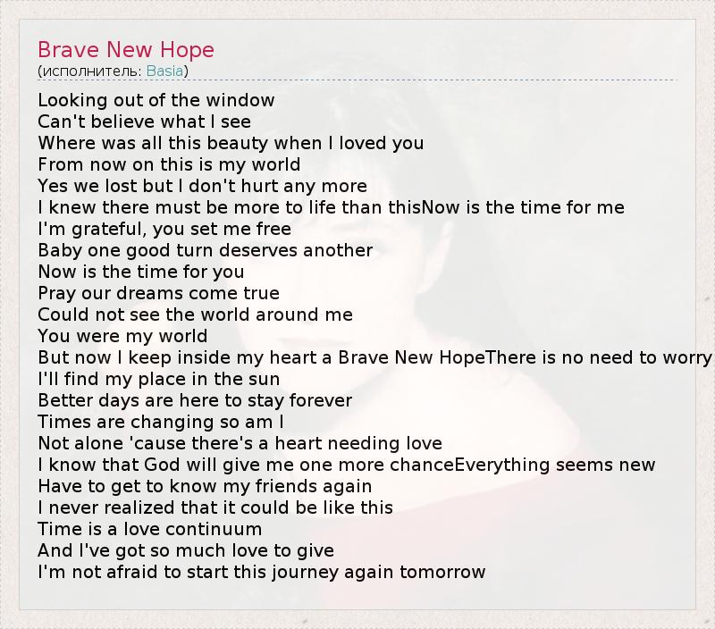 Looking out of the window Can't believe what I see Where was all this beauty when I loved you From now on this is my world Yes we lost but I don't hurt any more I knew there must be more to life than thisNow is the time for me I'm grateful, you set me free Baby one good turn deserves another Now is the time for you Pray our dreams come true Could not see the world around me You were my world But now I keep inside my heart a Brave New HopeThere is no need to worry I'll find my place in the sun Better days are here to stay forever Times are changing so am I Not alone 'cause there's a heart needing love I know that God will give me one more chanceEverything seems new Have to get to know my friends again I never realized that it could be like this Time is a love continuum And I've got so much love to give I'm not afraid to start this journey again tomorrow