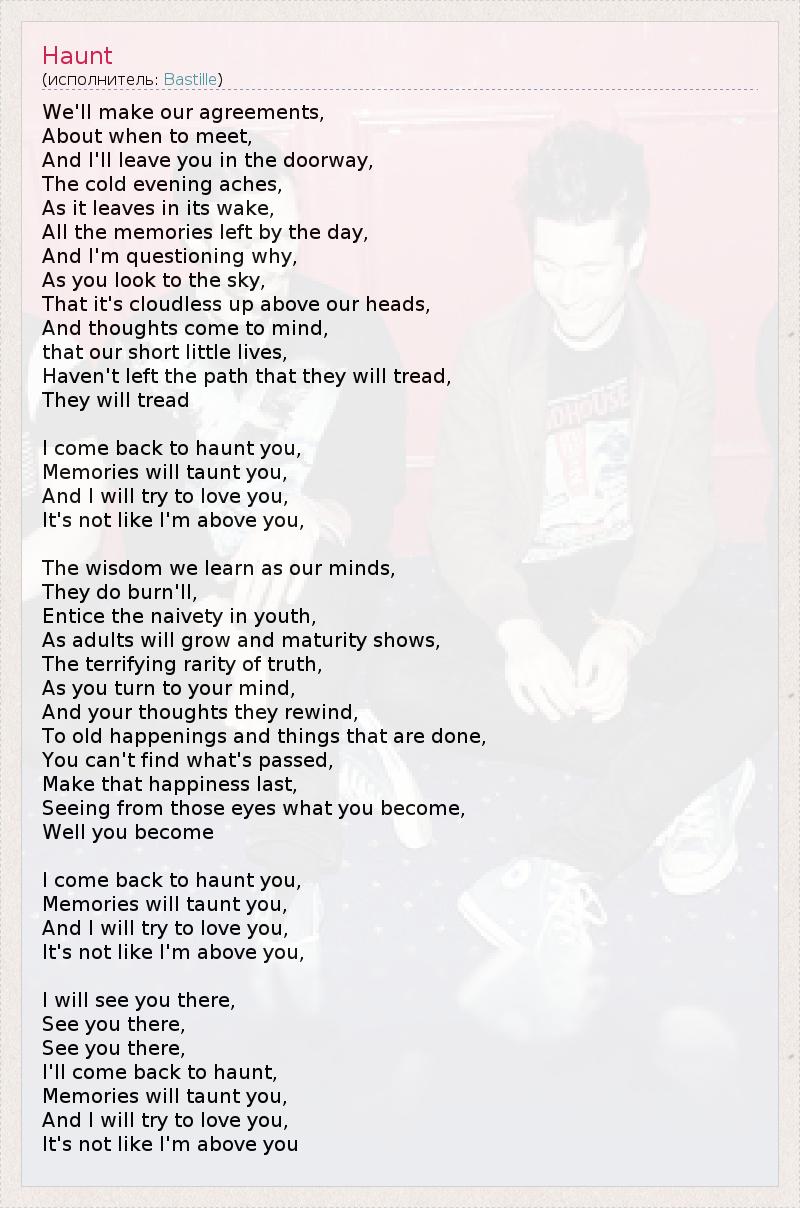 We'll make our agreements, About when to meet, And I'll leave you in the doorway, The cold evening aches, As it leaves in its wake, All the memories left by the day, And I'm questioning why, As you look to the sky, That it's cloudless up above our heads, And thoughts come to mind, that our short little lives, Haven't left the path that they will tread, They will tread I come back to haunt you, Memories will taunt you, And I will try to love you, It's not like I'm above you, The wisdom we learn as our minds, They do burn'll, Entice the naivety in youth, As adults will grow and maturity shows, The terrifying rarity of truth, As you turn to your mind, And your thoughts they rewind, To old happenings and things that are done, You can't find what's passed, Make that happiness last, Seeing from those eyes what you become, Well you become I come back to haunt you, Memories will taunt you, And I will try to love you, It's not like I'm above you, I will see you there, See you there, See you there, I'll come back to haunt, Memories will taunt you, And I will try to love you, It's not like I'm above you
