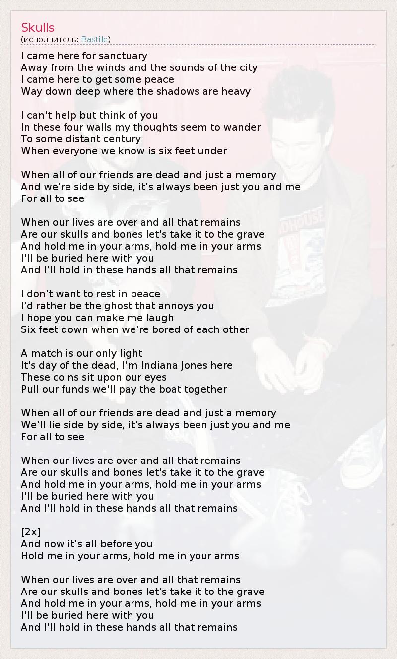 I came here for sanctuary Away from the winds and the sounds of the city I came here to get some peace Way down deep where the shadows are heavy I can't help but think of you In these four walls my thoughts seem to wander To some distant century When everyone we know is six feet under When all of our friends are dead and just a memory And we're side by side, it's always been just you and me For all to see When our lives are over and all that remains Are our skulls and bones let's take it to the grave And hold me in your arms, hold me in your arms I'll be buried here with you And I'll hold in these hands all that remains I don't want to rest in peace I'd rather be the ghost that annoys you I hope you can make me laugh Six feet down when we're bored of each other A match is our only light It's day of the dead, I'm Indiana Jones here These coins sit upon our eyes Pull our funds we'll pay the boat together When all of our friends are dead and just a memory We'll lie side by side, it's always been just you and me For all to see When our lives are over and all that remains Are our skulls and bones let's take it to the grave And hold me in your arms, hold me in your arms I'll be buried here with you And I'll hold in these hands all that remains [2x] And now it's all before you Hold me in your arms, hold me in your arms When our lives are over and all that remains Are our skulls and bones let's take it to the grave And hold me in your arms, hold me in your arms I'll be buried here with you And I'll hold in these hands all that remains