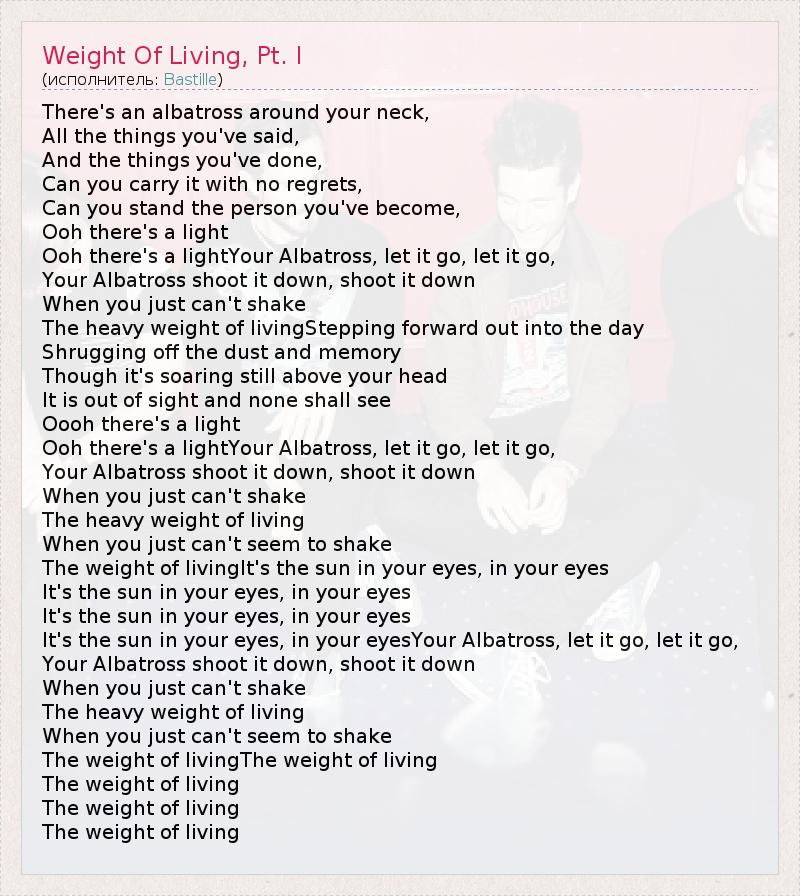 There's an albatross around your neck, All the things you've said, And the things you've done, Can you carry it with no regrets, Can you stand the person you've become, Ooh there's a light Ooh there's a lightYour Albatross, let it go, let it go, Your Albatross shoot it down, shoot it down When you just can't shake The heavy weight of livingStepping forward out into the day Shrugging off the dust and memory Though it's soaring still above your head It is out of sight and none shall see Oooh there's a light Ooh there's a lightYour Albatross, let it go, let it go, Your Albatross shoot it down, shoot it down When you just can't shake The heavy weight of living When you just can't seem to shake The weight of livingIt's the sun in your eyes, in your eyes It's the sun in your eyes, in your eyes It's the sun in your eyes, in your eyes It's the sun in your eyes, in your eyesYour Albatross, let it go, let it go, Your Albatross shoot it down, shoot it down When you just can't shake The heavy weight of living When you just can't seem to shake The weight of livingThe weight of living The weight of living The weight of living The weight of living