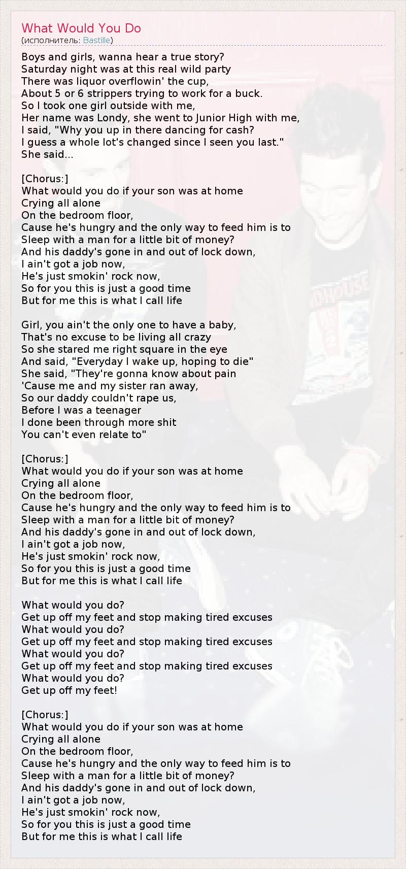 Мальчики и девочки, хотите услышать историю? Субботним вечером была дикая тусовка, Ликер струился из переполненных бокалов, Пять или шесть стриптизерш пытались заработать пару баксов. Я вышел с одной из них на улицу, Её звали Лонди, она ходила со мной в школу. Я спросил: "Почему ты здесь, танцуешь за деньги? Кажется, с нашей последней встречи многое изменилось". Она ответила: [Припев:] А что бы ты делал, если бы твой сын сидел дома Совсем один и плакал На полу в спальне? Потому что он голодный, и единственный способ его прокормить – Это переспать с мужиком за копейки? А его папаша опять в тюрьме. У меня нет работы, А он где-то курит крэк. Так что для тебя это – отлично проведенное время, А для меня это – жизнь. Знаешь, девочка, не у тебя одной ребенок. Такой безбашенной жизни нет никакого оправдания. Она посмотрела на меня честными глазами И сказала: "Каждое утро, открывая глаза, я хочу умереть". Она сказала: "Что они знают о боли. Я и моя сестра сбежали из дома, Чтобы отец не изнасиловал нас. А ведь я была ещё совсем ребенком. Я прошла через столько дер*ма, Сколько тебе и не снилось". [Припев:] А что бы ты делал, если бы твой сын сидел дома Совсем один и плакал На полу в спальне? Потому что он голодный, и единственный способ его прокормить – Это переспать с мужиком за копейки? А его папаша опять в тюрьме. У меня нет работы, А он где-то курит крэк. Так что для тебя это – отлично проведенное время, А для меня это – жизнь. Что бы ты делал? Я бы встал с колен и перестал искать себе слабые оправдания! Что бы ты делал? Я бы встал с колен и перестал искать себе слабые оправдания! Что бы ты делал? Я бы встал с колен и перестал искать себе слабые оправдания! Что бы ты делал? Я бы встал с колен! [Припев:] А что бы ты делал, если бы твой сын сидел дома Совсем один и плакал На полу в спальне? Потому что он голодный, и единственный способ его прокормить – Это переспать с мужиком за копейки? А его папаша опять в тюрьме. У меня нет работы, А он где-то курит крэк. Так что для тебя это – отлично проведенное время, А для меня это – жизнь.