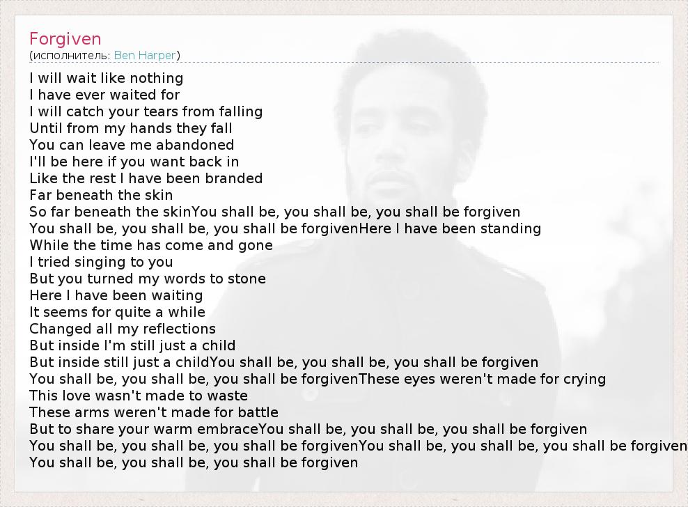 I will wait like nothing I have ever waited for I will catch your tears from falling Until from my hands they fall You can leave me abandoned I'll be here if you want back in Like the rest I have been branded Far beneath the skin So far beneath the skinYou shall be, you shall be, you shall be forgiven You shall be, you shall be, you shall be forgivenHere I have been standing While the time has come and gone I tried singing to you But you turned my words to stone Here I have been waiting It seems for quite a while Changed all my reflections But inside I'm still just a child But inside still just a childYou shall be, you shall be, you shall be forgiven You shall be, you shall be, you shall be forgivenThese eyes weren't made for crying This love wasn't made to waste These arms weren't made for battle But to share your warm embraceYou shall be, you shall be, you shall be forgiven You shall be, you shall be, you shall be forgivenYou shall be, you shall be, you shall be forgiven You shall be, you shall be, you shall be forgiven