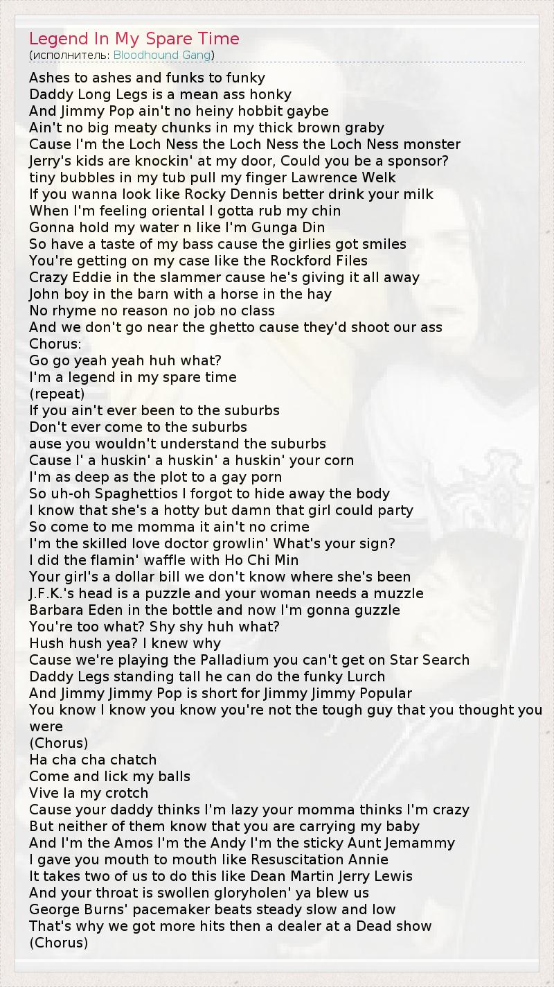 Ashes to ashes and funks to funky Daddy Long Legs is a mean ass honky And Jimmy Pop ain't no heiny hobbit gaybe Ain't no big meaty chunks in my thick brown graby Cause I'm the Loch Ness the Loch Ness the Loch Ness monster Jerry's kids are knockin' at my door, Could you be a sponsor? tiny bubbles in my tub pull my finger Lawrence Welk If you wanna look like Rocky Dennis better drink your milk When I'm feeling oriental I gotta rub my chin Gonna hold my water n like I'm Gunga Din So have a taste of my bass cause the girlies got smiles You're getting on my case like the Rockford Files Crazy Eddie in the slammer cause he's giving it all away John boy in the barn with a horse in the hay No rhyme no reason no job no class And we don't go near the ghetto cause they'd shoot our ass Chorus: Go go yeah yeah huh what? I'm a legend in my spare time (repeat) If you ain't ever been to the suburbs Don't ever come to the suburbs ause you wouldn't understand the suburbs Cause I' a huskin' a huskin' a huskin' your corn I'm as deep as the plot to a gay porn So uh-oh Spaghettios I forgot to hide away the body I know that she's a hotty but damn that girl could party So come to me momma it ain't no crime I'm the skilled love doctor growlin' What's your sign? I did the flamin' waffle with Ho Chi Min Your girl's a dollar bill we don't know where she's been J.F.K.'s head is a puzzle and your woman needs a muzzle Barbara Eden in the bottle and now I'm gonna guzzle You're too what? Shy shy huh what? Hush hush yea? I knew why Cause we're playing the Palladium you can't get on Star Search Daddy Legs standing tall he can do the funky Lurch And Jimmy Jimmy Pop is short for Jimmy Jimmy Popular You know I know you know you're not the tough guy that you thought you were (Chorus) Ha cha cha chatch Come and lick my balls Vive la my crotch Cause your daddy thinks I'm lazy your momma thinks I'm crazy But neither of them know that you are carrying my baby And I'm the Amos I'm the Andy I'm the sticky Aunt Jemammy I gave you mouth to mouth like Resuscitation Annie It takes two of us to do this like Dean Martin Jerry Lewis And your throat is swollen gloryholen' ya blew us George Burns' pacemaker beats steady slow and low That's why we got more hits then a dealer at a Dead show (Chorus)