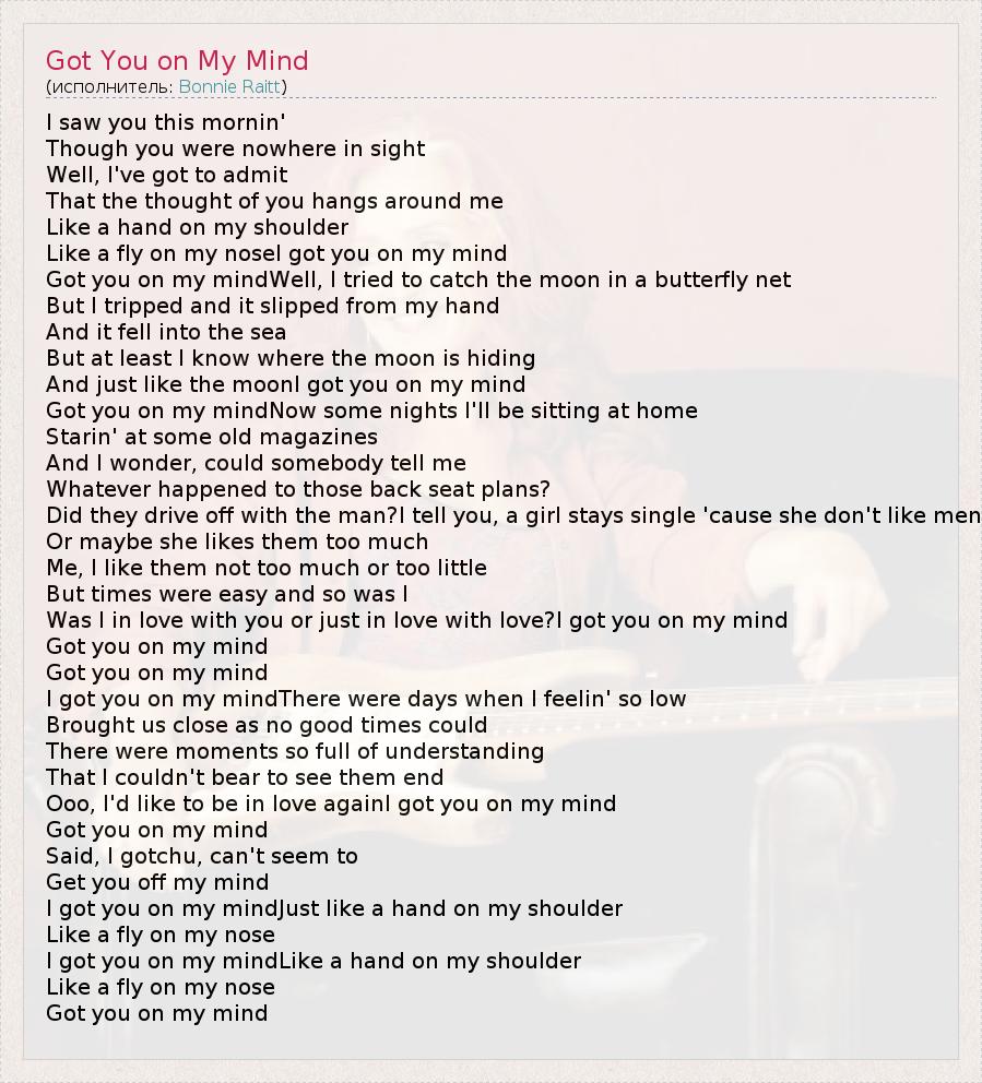 I saw you this mornin' Though you were nowhere in sight Well, I've got to admit That the thought of you hangs around me Like a hand on my shoulder Like a fly on my noseI got you on my mind Got you on my mindWell, I tried to catch the moon in a butterfly net But I tripped and it slipped from my hand And it fell into the sea But at least I know where the moon is hiding And just like the moonI got you on my mind Got you on my mindNow some nights I'll be sitting at home Starin' at some old magazines And I wonder, could somebody tell me Whatever happened to those back seat plans? Did they drive off with the man?I tell you, a girl stays single 'cause she don't like men Or maybe she likes them too much Me, I like them not too much or too little But times were easy and so was I Was I in love with you or just in love with love?I got you on my mind Got you on my mind Got you on my mind I got you on my mindThere were days when I feelin' so low Brought us close as no good times could There were moments so full of understanding That I couldn't bear to see them end Ooo, I'd like to be in love againI got you on my mind Got you on my mind Said, I gotchu, can't seem to Get you off my mind I got you on my mindJust like a hand on my shoulder Like a fly on my nose I got you on my mindLike a hand on my shoulder Like a fly on my nose Got you on my mind