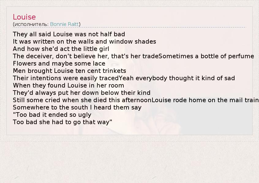 Это интересно:Безусловное украшение американской и мировой музыки. Уникальный по движению и глубине голос и потрясающий взыскательный музыкант! Bonnie Raitt родилась 8 ноября 1949 года в США, в Калифорнии, и прожила первые годы жизни в Лос-Анжелесе с родителями-музыкантами. Позже семья переехала на Восток в Массачусетс.Поздние 60-е были проникнуты в Америке абсолютно неподражаемым духом музыкальной... продолжение