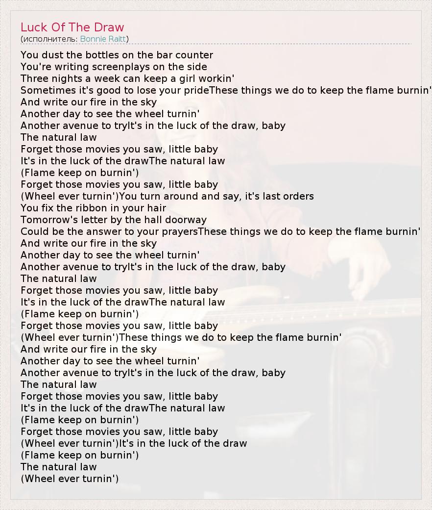 You dust the bottles on the bar counter You're writing screenplays on the side Three nights a week can keep a girl workin' Sometimes it's good to lose your prideThese things we do to keep the flame burnin' And write our fire in the sky Another day to see the wheel turnin' Another avenue to tryIt's in the luck of the draw, baby The natural law Forget those movies you saw, little baby It's in the luck of the drawThe natural law (Flame keep on burnin') Forget those movies you saw, little baby (Wheel ever turnin')You turn around and say, it's last orders You fix the ribbon in your hair Tomorrow's letter by the hall doorway Could be the answer to your prayersThese things we do to keep the flame burnin' And write our fire in the sky Another day to see the wheel turnin' Another avenue to tryIt's in the luck of the draw, baby The natural law Forget those movies you saw, little baby It's in the luck of the drawThe natural law (Flame keep on burnin') Forget those movies you saw, little baby (Wheel ever turnin')These things we do to keep the flame burnin' And write our fire in the sky Another day to see the wheel turnin' Another avenue to tryIt's in the luck of the draw, baby The natural law Forget those movies you saw, little baby It's in the luck of the drawThe natural law (Flame keep on burnin') Forget those movies you saw, little baby (Wheel ever turnin')It's in the luck of the draw (Flame keep on burnin') The natural law (Wheel ever turnin')