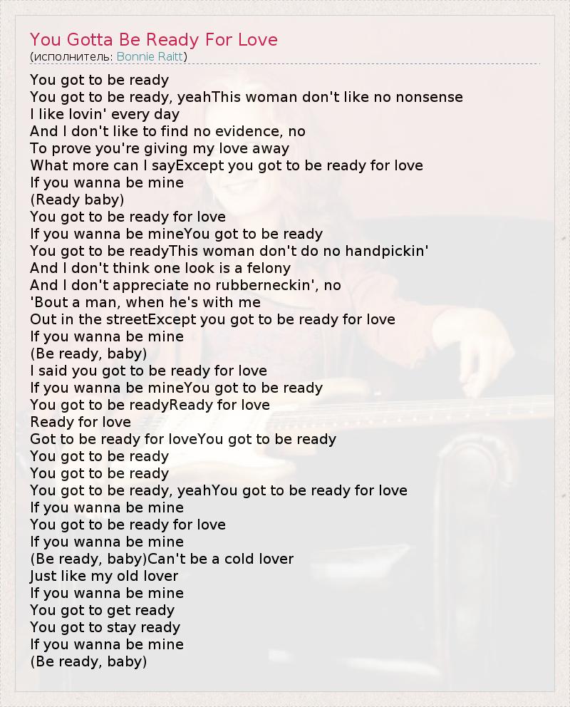 You got to be ready You got to be ready, yeahThis woman don't like no nonsense I like lovin' every day And I don't like to find no evidence, no To prove you're giving my love away What more can I sayExcept you got to be ready for love If you wanna be mine (Ready baby) You got to be ready for love If you wanna be mineYou got to be ready You got to be readyThis woman don't do no handpickin' And I don't think one look is a felony And I don't appreciate no rubberneckin', no 'Bout a man, when he's with me Out in the streetExcept you got to be ready for love If you wanna be mine (Be ready, baby) I said you got to be ready for love If you wanna be mineYou got to be ready You got to be readyReady for love Ready for love Got to be ready for loveYou got to be ready You got to be ready You got to be ready You got to be ready, yeahYou got to be ready for love If you wanna be mine You got to be ready for love If you wanna be mine (Be ready, baby)Can't be a cold lover Just like my old lover If you wanna be mine You got to get ready You got to stay ready If you wanna be mine (Be ready, baby)