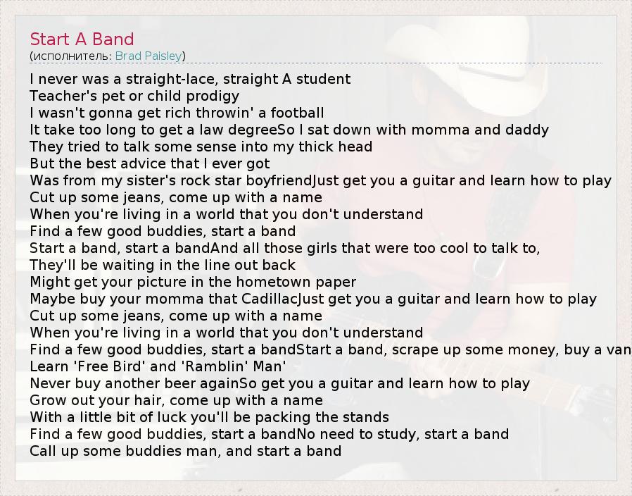 Это интересно:Родился 28 октября 1972 года в Глин Дейл, штат Виржиния, США. Еще с детства он обожал музыку в стиле кантри. Эту любовь ему привил его дедушка Уоррен Джарвис, который стал первым человеком поверившим в таланты юного мальчика. Когда Бреду исполнилось восемь, дед начал учить его игре на гитаре. А уже в двенадцать он написал свою первую песню. Когда Бреду Пейсли исполнилось тринадцать, он играл... продолжение