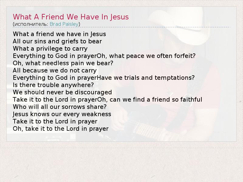 ГлавнаяИсполнителиBrad PaisleyWhat A Friend We Have In Jesus