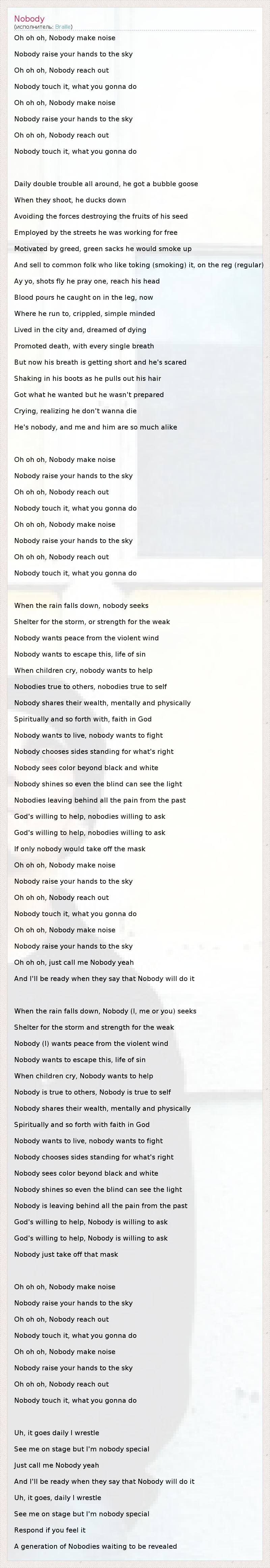 Oh oh oh, Nobody make noise Nobody raise your hands to the sky Oh oh oh, Nobody reach out Nobody touch it, what you gonna do Oh oh oh, Nobody make noise Nobody raise your hands to the sky Oh oh oh, Nobody reach out Nobody touch it, what you gonna do Daily double trouble all around, he got a bubble goose When they shoot, he ducks down Avoiding the forces destroying the fruits of his seed Employed by the streets he was working for free Motivated by greed, green sacks he would smoke up And sell to common folk who like toking (smoking) it, on the reg (regular) Ay yo, shots fly he pray one, reach his head Blood pours he caught on in the leg, now Where he run to, crippled, simple minded Lived in the city and, dreamed of dying Promoted death, with every single breath But now his breath is getting short and he's scared Shaking in his boots as he pulls out his hair Got what he wanted but he wasn't prepared Crying, realizing he don't wanna die He's nobody, and me and him are so much alike Oh oh oh, Nobody make noise Nobody raise your hands to the sky Oh oh oh, Nobody reach out Nobody touch it, what you gonna do Oh oh oh, Nobody make noise Nobody raise your hands to the sky Oh oh oh, Nobody reach out Nobody touch it, what you gonna do When the rain falls down, nobody seeks Shelter for the storm, or strength for the weak Nobody wants peace from the violent wind Nobody wants to escape this, life of sin When children cry, nobody wants to help Nobodies true to others, nobodies true to self Nobody shares their wealth, mentally and physically Spiritually and so forth with, faith in God Nobody wants to live, nobody wants to fight Nobody chooses sides standing for what's right Nobody sees color beyond black and white Nobody shines so even the blind can see the light Nobodies leaving behind all the pain from the past God's willing to help, nobodies willing to ask God's willing to help, nobodies willing to ask If only nobody would take off the mask Oh oh oh, Nobody make noise Nobody raise your hands to the sky Oh oh oh, Nobody reach out Nobody touch it, what you gonna do Oh oh oh, Nobody make noise Nobody raise your hands to the sky Oh oh oh, just call me Nobody yeah And I'll be ready when they say that Nobody will do it When the rain falls down, Nobody (I, me or you) seeks Shelter for the storm and strength for the weak Nobody (I) wants peace from the violent wind Nobody wants to escape this, life of sin When children cry, Nobody wants to help Nobody is true to others, Nobody is true to self Nobody shares their wealth, mentally and physically Spiritually and so forth with faith in God Nobody wants to live, nobody wants to fight Nobody chooses sides standing for what's right Nobody sees color beyond black and white Nobody shines so even the blind can see the light Nobody is leaving behind all the pain from the past God's willing to help, Nobody is willing to ask God's willing to help, Nobody is willing to ask Nobody just take off that mask Oh oh oh, Nobody make noise Nobody raise your hands to the sky Oh oh oh, Nobody reach out Nobody touch it, what you gonna do Oh oh oh, Nobody make noise Nobody raise your hands to the sky Oh oh oh, Nobody reach out Nobody touch it, what you gonna do Uh, it goes daily I wrestle See me on stage but I'm nobody special Just call me Nobody yeah And I'll be ready when they say that Nobody will do it Uh, it goes, daily I wrestle See me on stage but I'm nobody special Respond if you feel it A generation of Nobodies waiting to be revealed