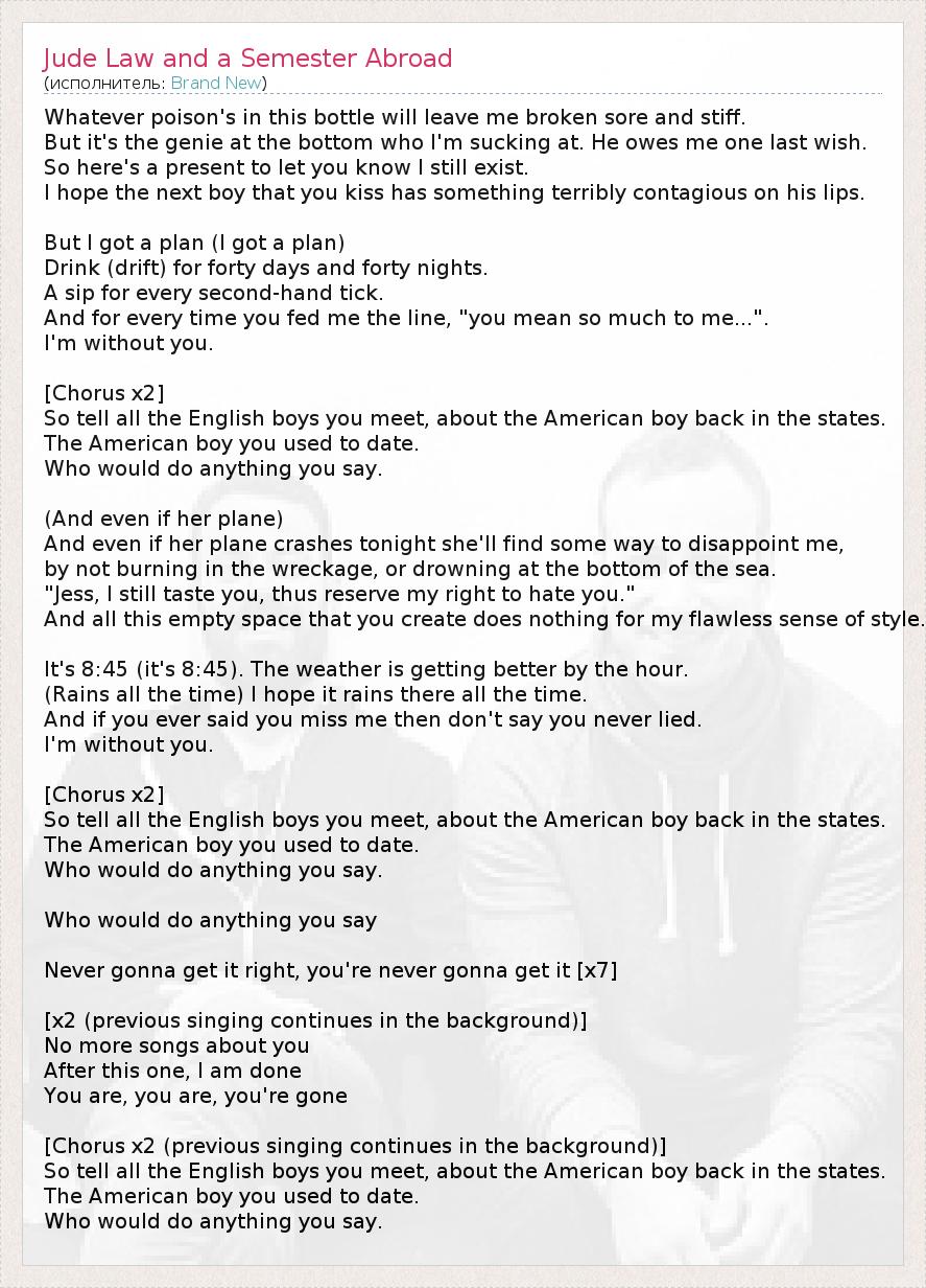 Whatever poison's in this bottle will leave me broken sore and stiff. But it's the genie at the bottom who I'm sucking at. He owes me one last wish. So here's a present to let you know I still exist. I hope the next boy that you kiss has something terribly contagious on his lips. But I got a plan (I got a plan) Drink (drift) for forty days and forty nights. A sip for every second-hand tick. And for every time you fed me the line, "you mean so much to me...". I'm without you. [Chorus x2] So tell all the English boys you meet, about the American boy back in the states. The American boy you used to date. Who would do anything you say. (And even if her plane) And even if her plane crashes tonight she'll find some way to disappoint me, by not burning in the wreckage, or drowning at the bottom of the sea. "Jess, I still taste you, thus reserve my right to hate you." And all this empty space that you create does nothing for my flawless sense of style. It's 8:45 (it's 8:45). The weather is getting better by the hour. (Rains all the time) I hope it rains there all the time. And if you ever said you miss me then don't say you never lied. I'm without you. [Chorus x2] So tell all the English boys you meet, about the American boy back in the states. The American boy you used to date. Who would do anything you say. Who would do anything you say Never gonna get it right, you're never gonna get it [x7] [x2 (previous singing continues in the background)] No more songs about you After this one, I am done You are, you are, you're gone [Chorus x2 (previous singing continues in the background)] So tell all the English boys you meet, about the American boy back in the states. The American boy you used to date. Who would do anything you say.