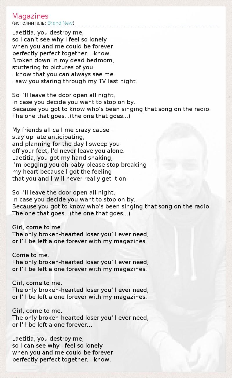Laetitia, you destroy me, so I can't see why I feel so lonely when you and me could be forever perfectly perfect together. I know. Broken down in my dead bedroom, stuttering to pictures of you. I know that you can always see me. I saw you staring through my TV last night. So I'll leave the door open all night, in case you decide you want to stop on by. Because you got to know who's been singing that song on the radio. The one that goes...(the one that goes...) My friends all call me crazy cause I stay up late anticipating, and planning for the day I sweep you off your feet, I'd never leave you alone. Laetitia, you got my hand shaking, I'm begging you oh baby please stop breaking my heart because I got the feeling that you and I will never really get it on. So I'll leave the door open all night, in case you decide you want to stop on by. Because you got to know who's been singing that song on the radio. The one that goes...(the one that goes...) Girl, come to me. The only broken-hearted loser you'll ever need, or I'll be left alone forever with my magazines. Come to me. The only broken-hearted loser you'll ever need, or I'll be left alone forever with my magazines. Girl, come to me. The only broken-hearted loser you'll ever need, or I'll be left alone forever with my magazines. Girl, come to me. The only broken-hearted loser you'll ever need, or I'll be left alone forever… Laetitia, you destroy me, so I can see why I feel so lonely when you and me could be forever perfectly perfect together. I know.